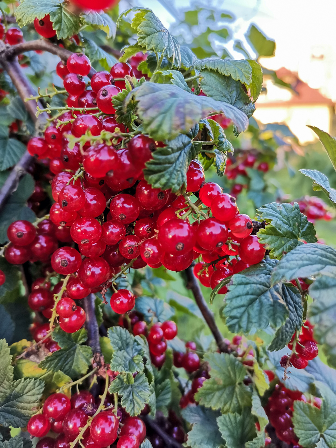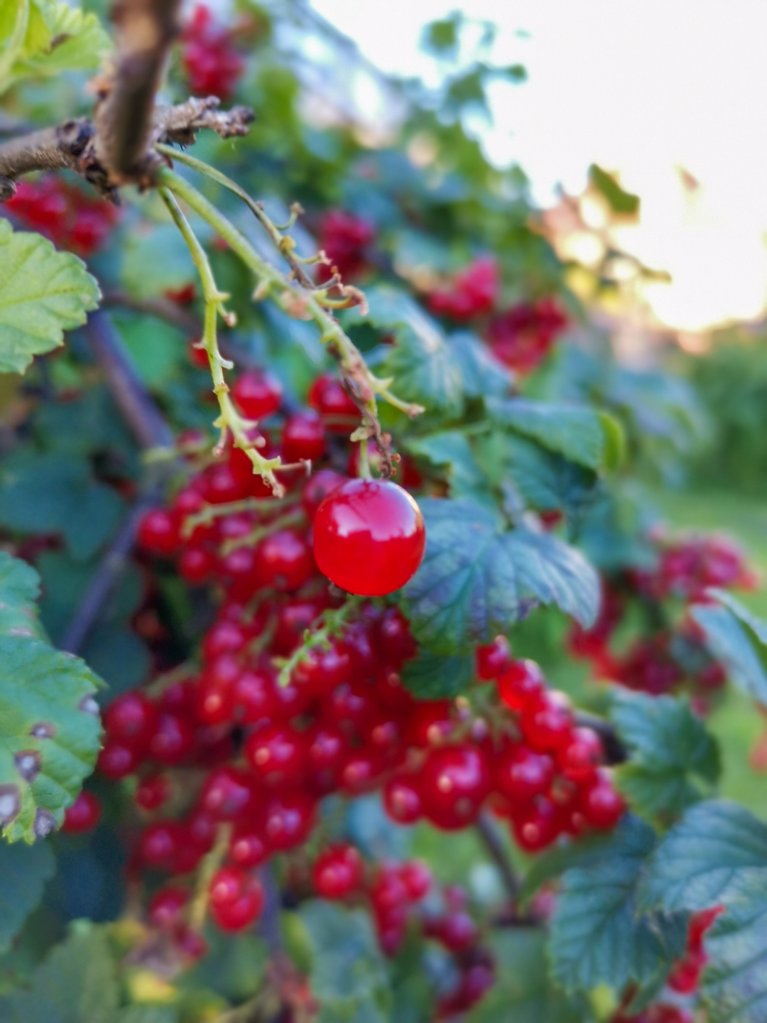 Záber vpravo v režime rozostrenia pozadia je mierne iného uhla aby sa do popredia dostala jedna ríbezľa. Všimnite si nielen dobre zvládnuté rozostrenie, ale aj odlesky na ríbezli.