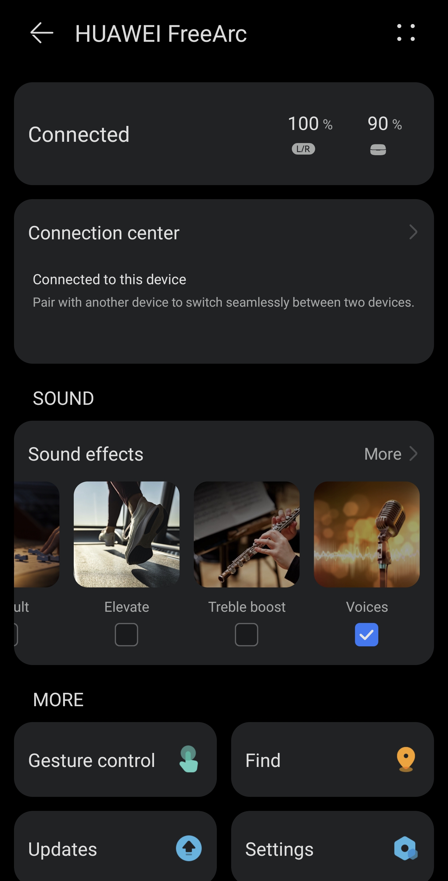 Ovládanie je podobne ako pri iných modeloch Huawei riešené dotykovo. Aplikácia Huawei AI Life, ktorú treba nainštalovať, umožňuje nastavenie, monitoring a aktualizáciu firmvéru. Zvukový prejav Huawei FreeArc patrí medzi lepšie v kategórii otvorených slúchadiel. Zvuk je čistý a muzikálny, s plnším podaním, najmä v oblasti vokálov. Výšky sú hladšie a menej ostré, no stále si zachovávajú detaily a presnosť. Toto naladenie je výhodné pri dlhšom počúvaní, napríklad počas jazdy na bicykli, keď nie je jednoduché neustále upravovať hlasitosť. Slúchadlá využívajú dynamické meniče s rozmermi 17 × 12 mm. Hoci sub-bas nemusí siahať tak hlboko ako pri niektorých iných modeloch, v reálnom počúvaní to nie je výrazne pozorovateľné. Dôležité je, že reprodukcia stredných basov je čistá, bez počuteľného skreslenia. Maximálna hlasitosť je vysoká a vo väčšine situácií postačuje úroveň okolo 70 – 80 %. Pre extrémne prípady ponúka aplikácia možnosť ďalšieho zosilnenia zvuku, čo zvýši maximálnu hlasitosť až pod 100 dBA, ale táto úroveň sa neodporúča na dlhodobé počúvanie. Aplikácia poskytuje aj štyri prednastavené ekvalizéry a 10-pásmový vlastný ekvalizér na detailné prispôsobenie zvuku. Čo sa týka úniku zvuku, Huawei implementoval technológiu spätných zvukových vĺn na jeho zmiernenie. Funguje to do istej miery, ale efekt je čiastočne kompenzovaný vysokou maximálnou hlasitosťou. Zvuk je stále počuteľný zhruba z metrovej vzdialenosti. Vonku to nepredstavuje problém, ale vo veľmi tichej miestnosti môžu ľudia okolo vás počuť, že niečo počúvate.