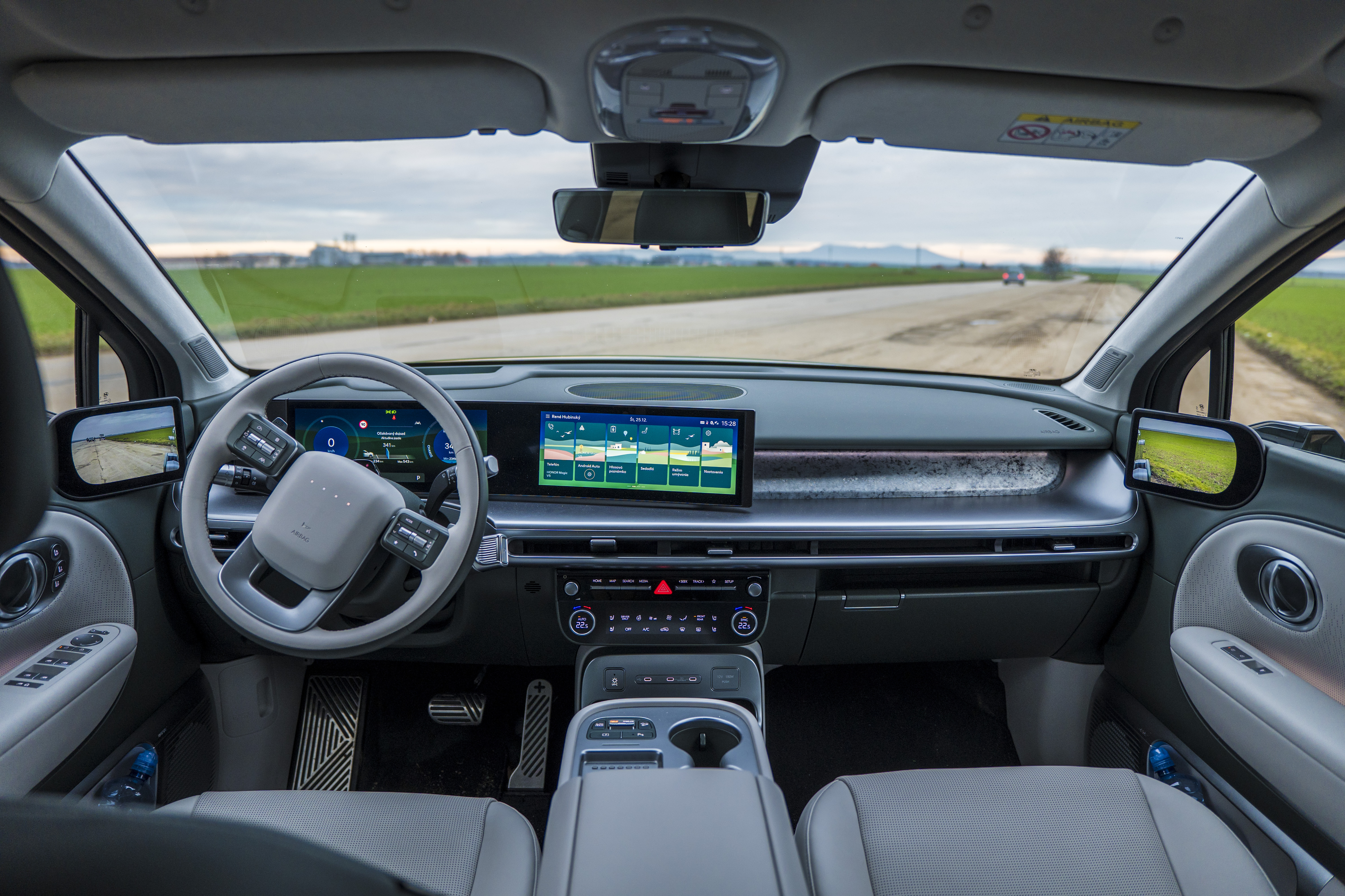Pochopiteľne, jedna z najzaujímavejších vecí v aute je pohonný systém. Ten je pre všetky výkonové verzie postavený na batérii NMC s celkovou kapacitou 110,3 kWh s 800 V systémom. IONIQ 9 môžete mať v troch výkonových variantoch. Základ tvorí „zadokolka“ s výkonom 160 kW a krútiacim momentom 350 kW, ktorá zvládne zrýchlenie z 0 na 100 km/h za 9,4 s. Niekomu by sa mohol takýto výkon na také veľké auto zdať nízky, ale môžete si ho jednoducho porovnať pri jazde s niektorou z verzií s pohonom všetkých kolies. Ak pri tých zaradíte režim EKO, vozidlo využíva iba zadný motor bez pripájania predného, takže jazdí v podstate rovnako ako zadokolka, iba s tým rozdielom, že má vpredu ako záťaž aj prednú pohonnú jednotku. Stredná výkonová verzia pridáva k zadnému 160 kW motoru aj predný s výkonom 66 kW. S celkovým výkonom 226 kW a krútiacim momentom 650 Nm tak zvláda zrýchlenie z 0 na 100 km/h za 6,5 s. Pohon testovanej najvýkonnejšej verzie Calligraphy zabezpečuje dvojica elektromotorov s výkonom po 157 kW. S celkovým výkonom 314 kW a krútiacim momentom 700 Nm vozidlo zrýchli z 0 na 100 km/h za bleskových 5,2 sekundy. DC nabíjanie vďaka podpore až 230 kW nabíjania zvládne nabitie z 10 na 80 % už za 24 minút. Vo výbave je aj známa technológia Vehicle-to-Load (V2L) s výstupom 230 V, 3,6 kW, ktorá dokáže napájať externé elektrické spotrebiče. Porty USB poskytujú výkon až 100 W, takže môžete nabíjať aj výkonnejšie zariadenia ako notebook a podobne. Na maximálny jazdný komfort je tu vozidlo vybavené samonivelačnými tlmičmi vzadu, pričom o ticho v kabíne sa stará systém Active Noise Control-Road, ktorý aktívne potláča hluk z vozovky. Aby ste sa mohli rozprávať aj s osobami v treťom rade, je vo výbave interkom s mikrofónmi nad všetkými sedadlami.
