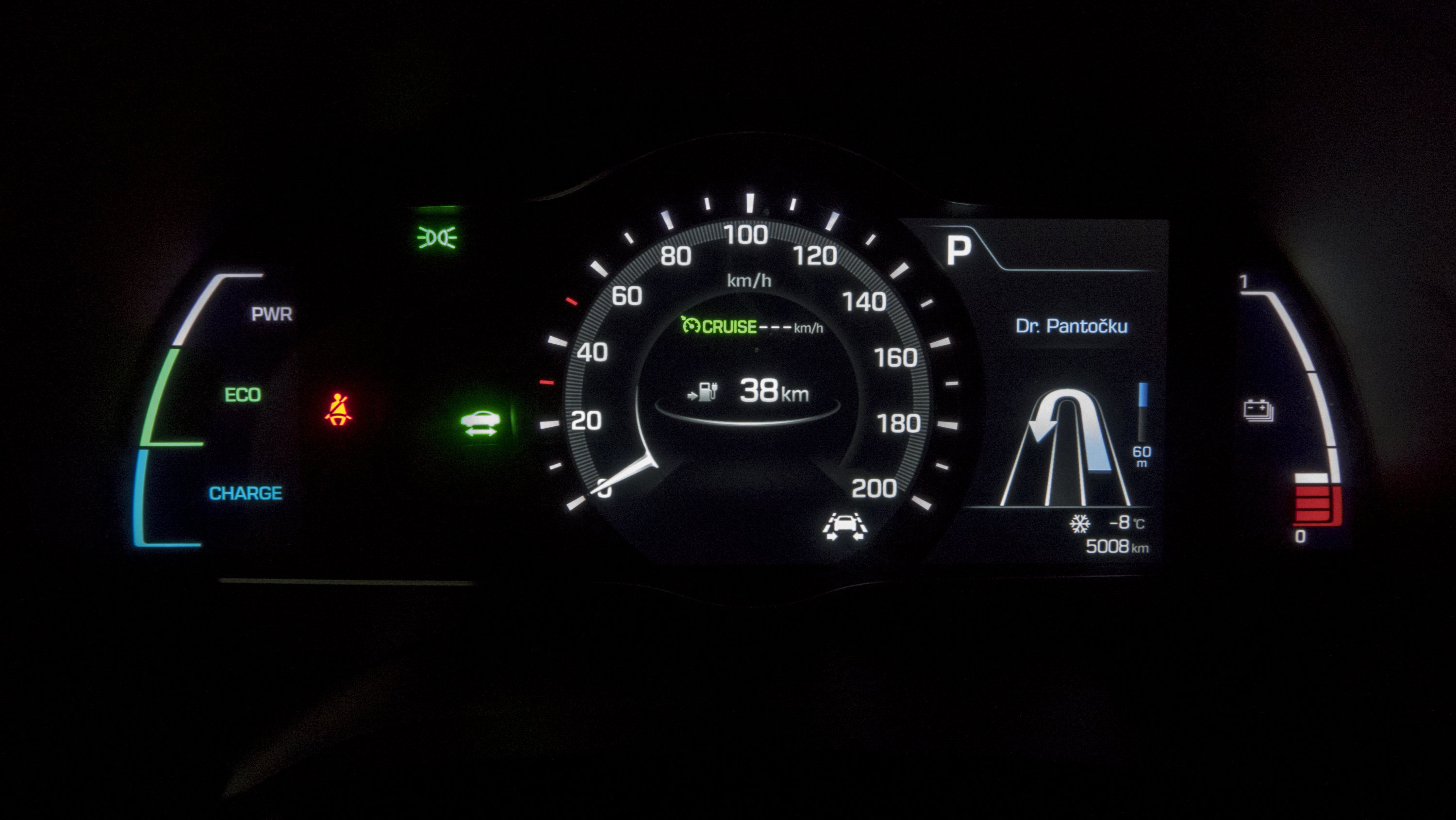 Ioniq na nás hneď pri prvom nasadnutí urobil dojem. Elektricky nastaviteľné sedadlo vodiča vás po zatvorení dverí prisunie do prednastavenej polohy. Ak jazdíte dvaja, môžete si svoju polohu uložiť do pamäte. Zaujme bohatá výbava, ktorá sa pri elektromobiloch tak často nevidí. Nájdete v nej adaptívny tempomat, systém LKAS na aktívne sledovanie jazdného pruhu, parkovacie senzory vpredu aj vzadu, kompletné LED osvetlenie okrem diaľkových svetiel, vyhrievanie všetkých sedadiel aj volantu a viaceré bezpečnostné systémy, ktoré zabezpečujú núdzové brzdenie, sledovanie mŕtveho uhla aj premávky za vozidlom, a veľa ďalších. Prepínanie denných a stretávacích svetiel je automatické. Diaľkové svetlá sú trochu nepochopiteľne halogénové a ovládajú sa ručne. Palubný multimediálny systém s navigáciou umožňuje pripojenie cez bluetooth, Wi-Fi aj USB. Po spárovaní s mobilom sa načíta zoznam kontaktov do vozidla, takže všetko ovládate z displeja. Z mobilu môžete urobiť prístupový bod, na ktorý sa autom pripojíte. Máte tak k dispozícii aktuálne počasie aj dopravné informácie. Táto funkcia pracovala veľmi dobre a umožnila nám elegantne obísť bratislavské zápchy. Ovládanie jazdných režimov je zverené netradične štvorici veľkých tlačidiel na stredovej konzole.