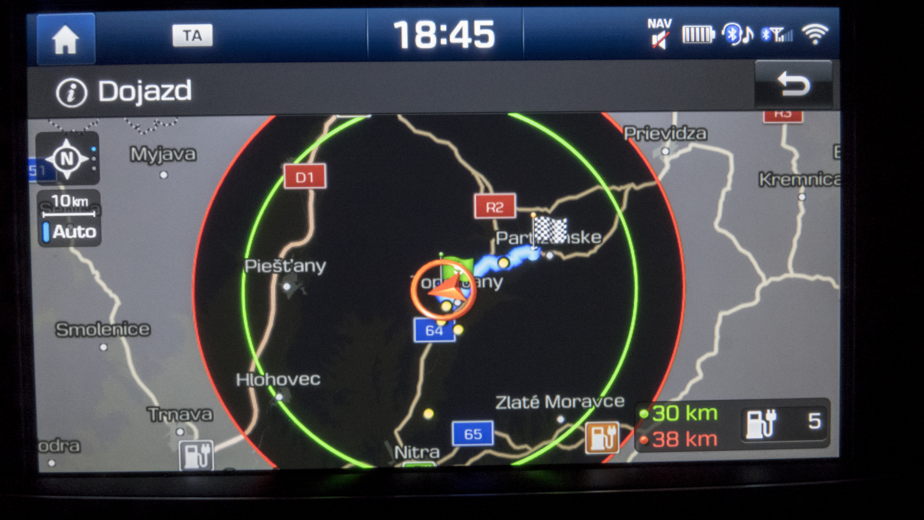 Za jazdy senzory strážia mŕtvy uhol a signalizujú vozidlo vo vedľajšom pruhu rozsvietením kontrolky v spätnom zrkadle. Pri vyhodení smerovky sa ozve aj zvukový signál. Rovnaké senzory vás upozornia aj na rýchlo sa približujúce vozidlo zozadu. Navigačný systém je integrovaný s ostatnými časťami informačno-zábavného systému, takže povely navigácie si môžete dať zobrazovať aj na prístrojovom paneli. Ten poskytuje množstvo informácií o jazdných režimoch, toku energie aj štatistiky. V strede je vždy viditeľný dojazd na batériu v kilometroch. Páčilo sa nám, že tento údaj je smerodajný, takže ak pred jazdou nastavíte kúrenie a pôjdete bežným štýlom, môžete sa naň spoľahnúť. Ak počas jazdy zvýšite či znížite prednastavenú teplotu, údaj sa prepočíta. Na hlavnom displeji si okrem navigácie a multimédií možno zobraziť aj panel Elektrické vozidlo, na ktorom sa prehľadne zobrazuje dojazd v km, najbližšia nabíjacia stanica a úroveň nabitia batérie v percentách. Po kliknutí na dojazd sa vám na mape zobrazí akčný rádius s aktuálnym stupňom nabitia. Zobraziť si môžete aj aktuálnu spotrebu, kde vidíte spotrebu motora, kúrenia a ostatných systémov. Užitočné je zobrazenie najbližších nabíjačiek, ktoré si môžete filtrovať hoci podľa typu zásuvky a nechať sa navigovať priamo k vybranej nabíjačke. Funkčnosť nás však trocha sklamala. V databáze sa nezobrazili všetky nabíjačky, a keď sme sa nechali k dvom v Nitre navigovať, ani jedna nebola zadaná presne. V prípade nabíjačky RWE nás navigácia zaviedla o 1,5 km mimo. Na tom budú musieť vývojári popracovať. Palubná doska je trošku „pretlačidlovaná“, ale po chvíli sa na to dá zvyknúť. Veľa funkcií možno ovládať priamo z volantu. Na stredovej konzole je vpredu štvorica tlačidiel radenia, vpred, vzad, parkovanie a neutrál. V zadnej časti je okrem vyhrievania sedadiel, volantu a vypnutia predných senzorov aj ovládač jazdných módov Normal, Sport a Eco, zapnutie Auto Hold (pri zabrzdení na križovatke nemusíte stáť na brzde) a ručná brzda. Ich umiestnenie je však dosť nepraktické a počas jazdy odvádza pozornosť. Na strednom paneli je vpredu priehradka na mobil so vstavanou bezdrôtovou rýchlonabíjačkou systému QI. So Samsung Galaxy S6 fungovala bez problémov.