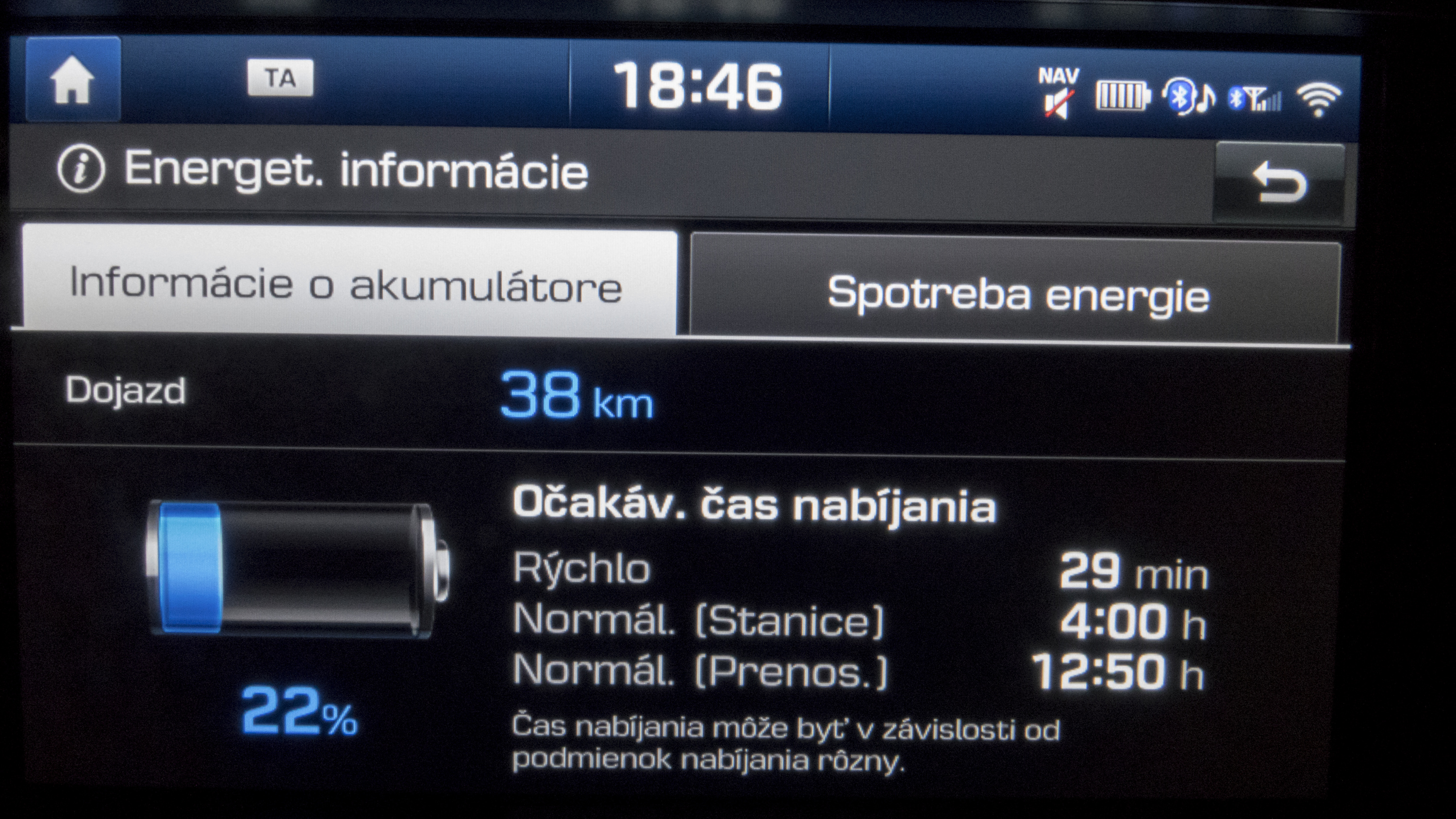 Týždenné testovanie sme si patrične užívali, aj keď sa na nás dostal rad v najmenej priaznivom období pre elektromobil. Vonkajšie teploty klesali v noci pod – 15 °C a cez deň sa ledva vyšplhali na – 5 °C. To sa, pochopiteľne, odrazilo aj na výdrži batérie, a teda výslednom dojazde. Na druhej strane sme si vyskúšali používanie elektromobilu práve v takýchto extrémnych podmienkach. Pri + 20 °C je dobrý každý. Pri nízkych teplotách práve Li-Pol batérie rýchle strácajú kapacitu, a tak treba riešiť udržiavanie ich teploty v prijateľných medziach. To síce odčerpáva určitú časť energie, ale nie toľko ako pri ich podchladení. V zimných podmienkach treba aj vykurovať, čo sa na spotrebe prejaví dosť výrazne. Výhodné je, že počas nabíjania si môžete nastaviť časovač s časom, keď budete auto potrebovať. Na túto hodinu bude vykúrené na prednastavenú teplotu a odmrazené, použije sa pri tom energia zo siete, takže batéria bude plne nabitá. Rovnako si môžete nastaviť aj čas nabíjania, ak napríklad doma využívate nočnú tarifu, bude sa nabíjať v rámci vyhradeného času. K autu dostanete nabíjací kábel, ktorý umožní nabíjanie z bežnej 220 V zásuvky (Schuko). Palubná nabíjačka dodá výkon 6,6 kW, takže auto nabijete asi za 10 – 11 hodín v závislosti od stupňa vybitia a teploty. Vo výbave je konektor DC Combo 2, takže môžete nabíjať aj z domácej dokúpiteľnej nástennej zásuvky 3× 380 V, v tomto prípade sa čas nabíjania skráti asi na 4,5 hodiny. Môžete takisto využiť rýchle nabíjanie na verejných nabíjacích staniciach. Vozidlo umožňuje nabíjať až výkonom 100 kW (asi 23 min). My sme nabíjali na rýchlonabíjacej stanici ZSE s výkonom 55 kW. Tá nám batériu nabila za 30 minút, pričom nabíjanie sa skončilo pri 94 %. Nabíjanie na verejných staniciach je kapitola sama osebe. Na rýchlonabíjačku potrebujete zväčša kartu od prevádzkovateľa, ktorú si musíte vybaviť vopred. Najväčšiu sieť u nás prevádzkuje spoločnosť Greenway, nabíjanie je však spoplatnené podľa času nabíjania, takže napríklad 20 minút nabíjania vás stojí 10 eur. Za tento čas nabijete asi na 80 km jazdy, takže vás 100 km vyjde viac ako na benzínovom aute. ZSE zatiaľ poskytuje nabíjanie zadarmo, potrebná je však karta, ktorú si musíte vyzdvihnúť v ZSE. Využijete ju však zatiaľ iba na 4 miestach v Bratislave. Ďalšie verejné nabíjačky majú rôzne umiestnenia a aj podmienky používania. Často potrebujete špeciálne karty alebo aj káble. Takže dlhšia jazda elektromobilom s takýmto dojazdom je dnes viac dobrodružstvo než praktické cestovanie, a ak si aj trasu pozorne naplánujete, nikde nie je napísané, že na nabíjacom mieste nenájdete parkovať arogantného vodiča s klasickým autom, ako sa nám to stalo v Nitre. Ioniq je však určený predovšetkým ako druhé auto do rodiny pre používateľov denne dochádzajúcich asi 50-60 km od domova, prípadne ďalej s možnosťou dobíjania počas dňa. Vzhľadom na to, že u nás zatiaľ na sídliskách nabíjačky bežne nenájdete, jeden z predpokladov je rodinný dom alebo aspoň elektrifikovaná garáž.