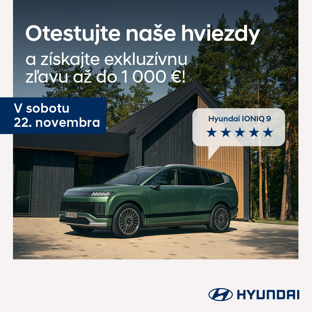Hyundai Slovensko spustil špeciálnu kampaň s názvom Otestujte naše hviezdy, ktorá zákazníkom ponúka možnosť vyskúšať si vybraný model Hyundai a získať pritom zľavový kupón v hodnote 1 000 €, 750 € alebo 500 €. Akcia sa uskutoční v sobotu 22. novembra 2025 v autorizovaných predajniach Hyundai po celom Slovensku.