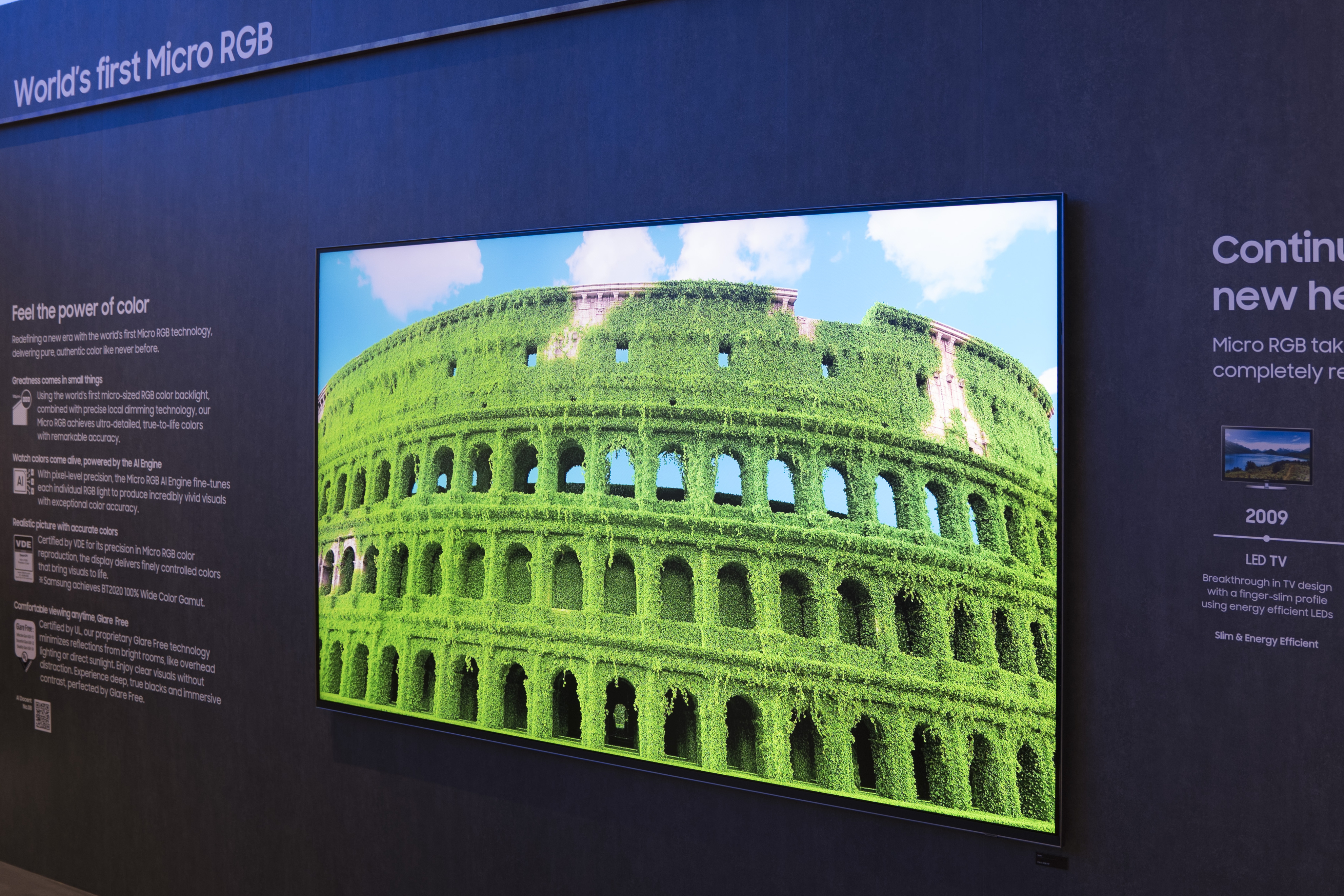 Jedným z ťahákov stánku bol aj 115" televízor s novou technológiou podsvietenia Micro RGB, prísľub budúcnosti displejov. Namiesto modrého podsvietenia s kvantovými bodmi (QLED) používa LCD panel a podsvietenie z hustej matice miniatúrnych RGB LED, pričom každá dióda má samostatný červený, zelený a modrý pixel. Táto štruktúra umožňuje presnejšie lokálne stmievanie, hlbšiu čiernu, menej rozmazania a živšie farby. Obraz zaujme jasom, 100 % pokrytím Rec.2020 a detailmi v tmavých scénach. Model je už na niektorých trhoch v ponuke vo veľkosti 115" približne za 35 000 eur, pričom ide o dostupnejšiu alternatívu než Micro LED.