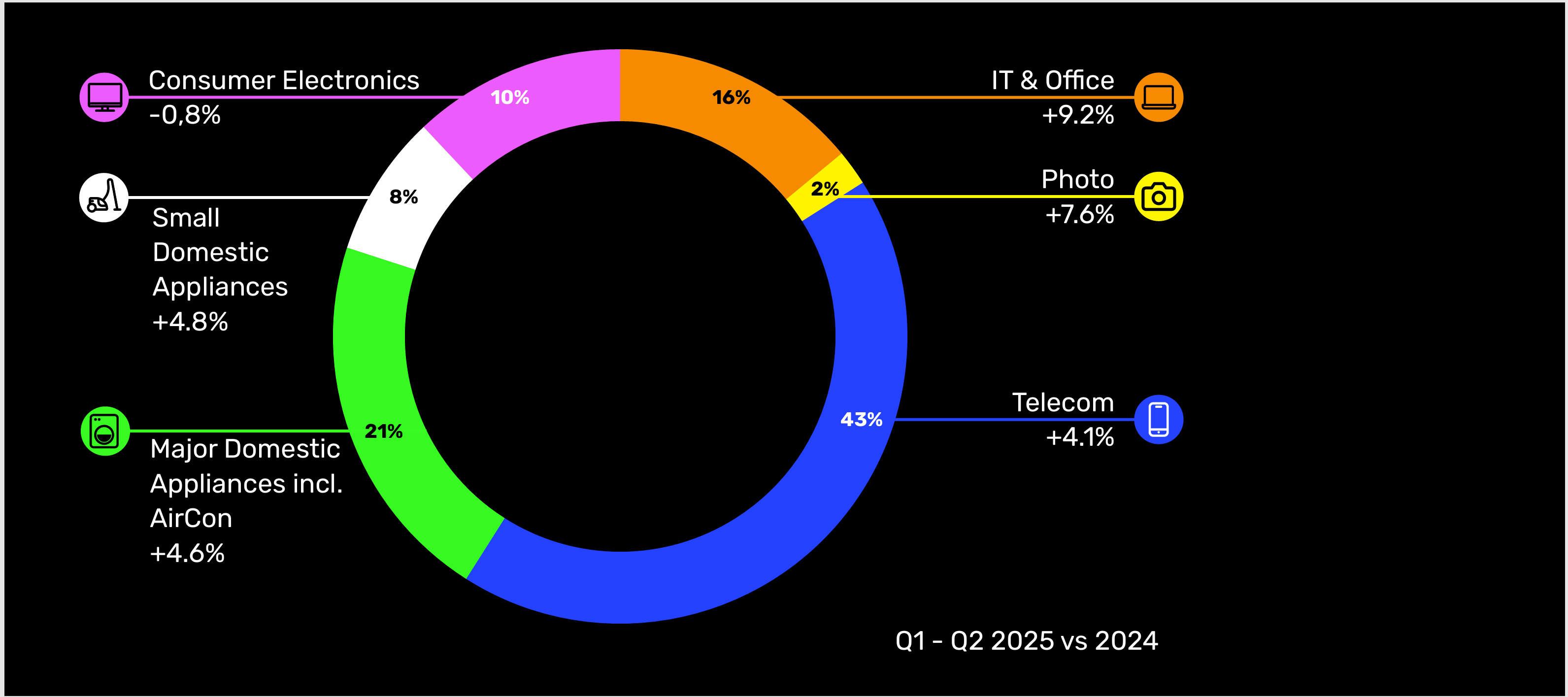 Počas úvodnej tlačovej konferencie analytici spoločnosti GFU predikovali a vysvetľovali makroekonomické vplyvy. Dynamiku trhu spotrebnej elektroniky v súčasnosti výrazne formujú nielen inovácie, ale do značnej miery aj geopolitický protekcionizmus, teda neustále sa meniaca colná politika USA. Najnovšia prognóza Medzinárodného menového fondu z júna 2025 predpokladá rast globálneho HDP v roku 2026 na úrovni 3,1 %. Rast brzdí slabý spotrebiteľský dopyt a nepredvídateľnosť politiky, ktorá núti spotrebiteľov zdržiavať sa výdavkov. Napriek tomu bol v segmente spotrebnej elektroniky dosiahnutý medziročný rast 4,6 %, podporený rôznymi stimulačnými opatreniami a prirodzeným cyklom výmeny, predovšetkým v oblasti IT, kde bol dosiahnutý medziročný rast až 9,2 %. Telekomunikačný sektor zaznamenal rast 4,1 %, segment veľkých domácich spotrebičov vrátane klimatizácií 4,6 % a malých domácich spotrebičov 4,8 %.