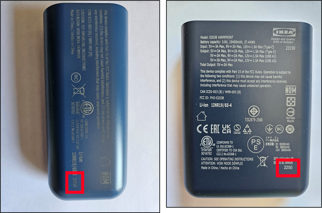 Napriek tomu sme si všimli, že určité powerbanky VARMFRONT môžu predstavovať riziko požiarnej bezpečnosti v dôsledku výrobnej chyby. Táto chyba sa týka len jednotiek s vyššie uvedenými časovými známkami. Preto tieto powerbanky VARMFRONT sťahujeme z obehu. Zákazníci, ktorí vlastnia takýto výrobok, by ho mali okamžite prestať používať a kontaktovať IKEA so žiadosťou o náhradný výrobok alebo o vrátenie celej sumy. Časová známka powerbanky je uvedená na zadnej strane v pravom dolnom rohu.