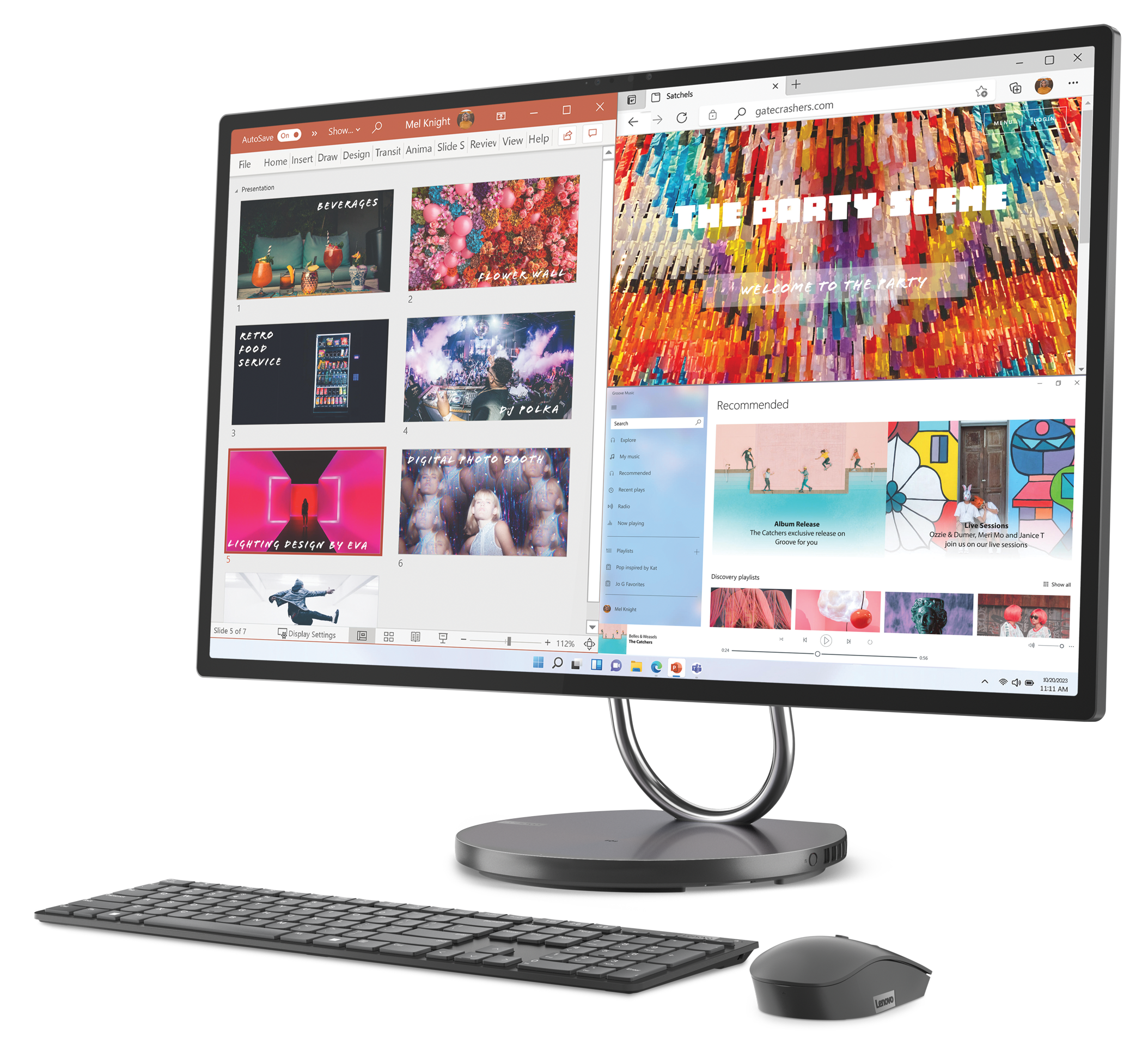 Počítače typu all-in-one (AiO) čiže všetko v jednom poskytujú komfort práce typický pre klasické stolové PC, šetria miesto na pracovnom stole a zbavia vás spleti káblov. Všetky potrebné komponenty sú integrované v monitore, v tomto prípade v podstavci. Veľký monitor vám umožní komfortnú prácu a táto koncepcia vám rovnako ako PC poskytne aj ergonomickú flexibilitu, pretože klávesnicu a myš, najčastejšie bezdrôtové, si na pracovnom stole môžete umiestniť tam, kde vám to najviac vyhovuje. V balení je, samozrejme, aj dizajnovo zladená bezdrôtová klávesnica a myš.