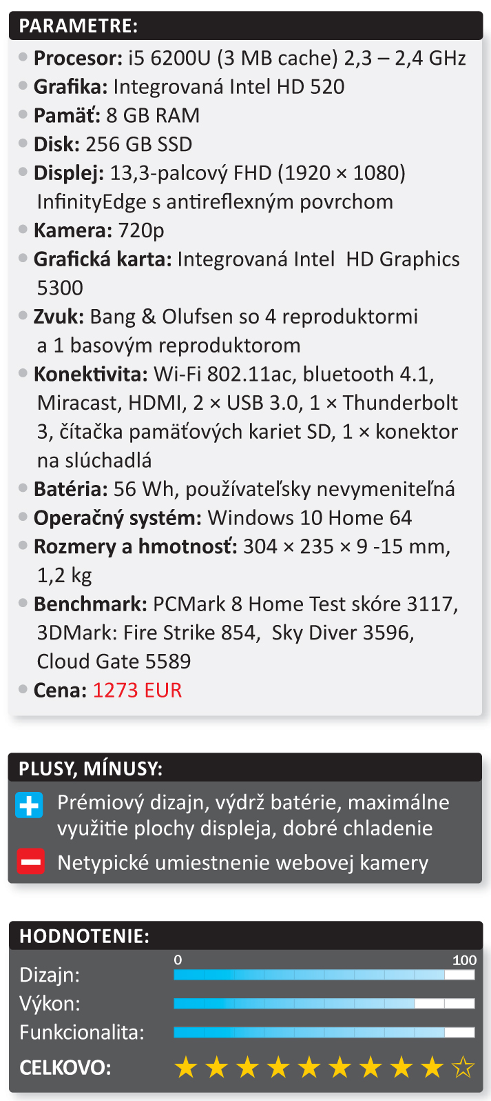 Procesor Intel Core 6. generácie s novou grafikou Intel HD ponúka nielen vyšší výkon, ale predovšetkým nižšiu energetickú náročnosť. Tá sa priaznivo podpísala nielen na výdrži pri práci na batériu (pri FHD modeli až 18 hodín), ale aj na nižšej produkcii tepla. V praxi pri kancelárskom používaní je výdrž 13 až 14 hodín. Komu by to nestačilo, môže si dokúpiť externú batériu Dell Power Companion. Tandem procesor, disk SSD a Windows 10 umožňuje nábeh v priebehu niekoľkých sekúnd. Výkon sme testovali nielen na kancelárskych aplikáciách, ale aj pri niekoľkých bežných hrách a editovaní full HD videa v aplikácii Pinnacle Studio. Absenciu výkonu sme nezaznamenali, obnovovaciu frekvenciu pri hrách či rýchlosť renderovania videa, samozrejme, nemôžeme porovnávať s hernými notebookmi s dedikovanými grafickými kartami.