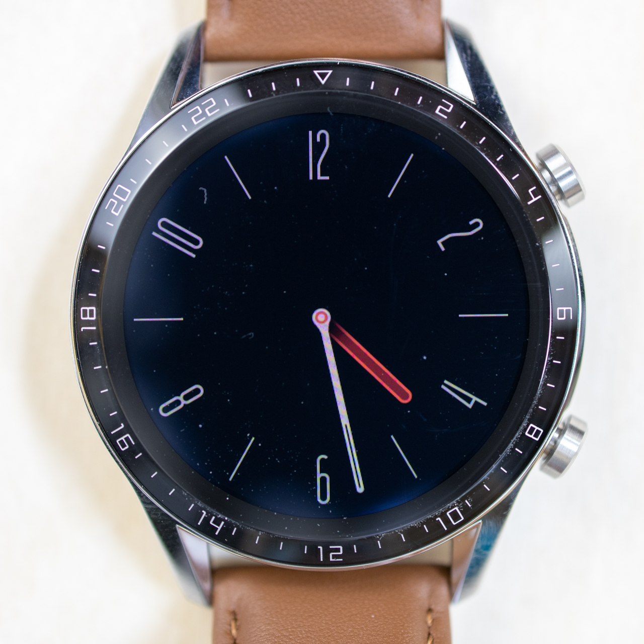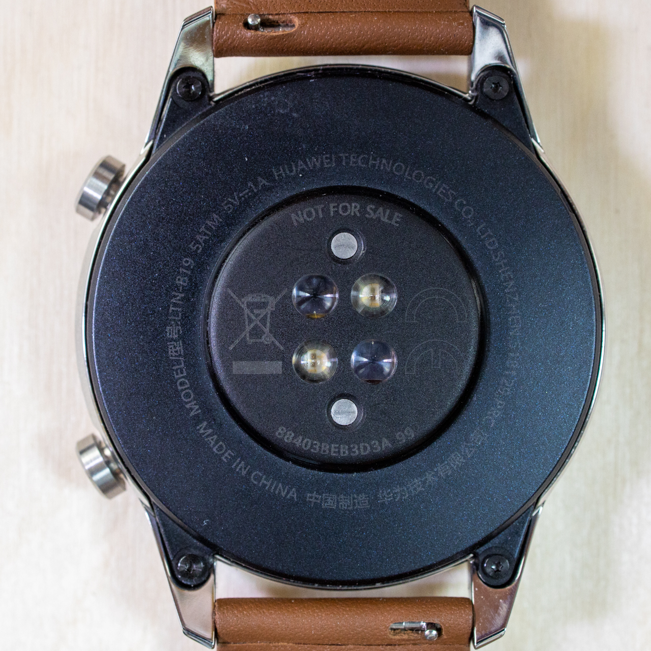 Huawei Watch GT2 má remienok svetlohnedej farby z kože alebo materiálu pripomínajúceho kožu. V balení nájdete aj čierny silikónový remienok. Veľkosť 46 mm je typicky pánska, a preto aj remienky sú rozmerovo dimenzované na chlapskú ruku. Dodáva sa aj menší variant s „dámskym“ rozmerom 42 mm. V balení nájdete ešte nabíjačku s moderným konektorom USB-C a káblik USB-A/USB-C. Nabíjanie je kontaktné pomocou dvoch pozlátených kontaktov.