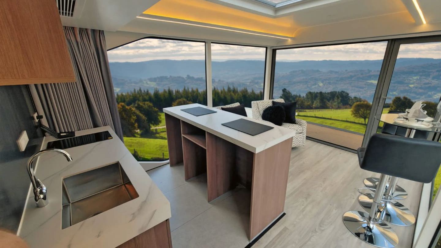 Jedna z najlepších vecí na E9 sú 270-stupňové panoramatické okná. O súkromie sa však netreba obávať. Inteligentné závesy možno aktivovať jednoduchým stlačením tlačidla. Kuchyňa E9 je vybavená indukčnou varnou doskou s dvoma platňami a množstvom priestoru na pulte. K dispozícii je kúpeľňa so sprchovacím kútom a veľkým WC. Do spálne sa zmestí manželská posteľ.