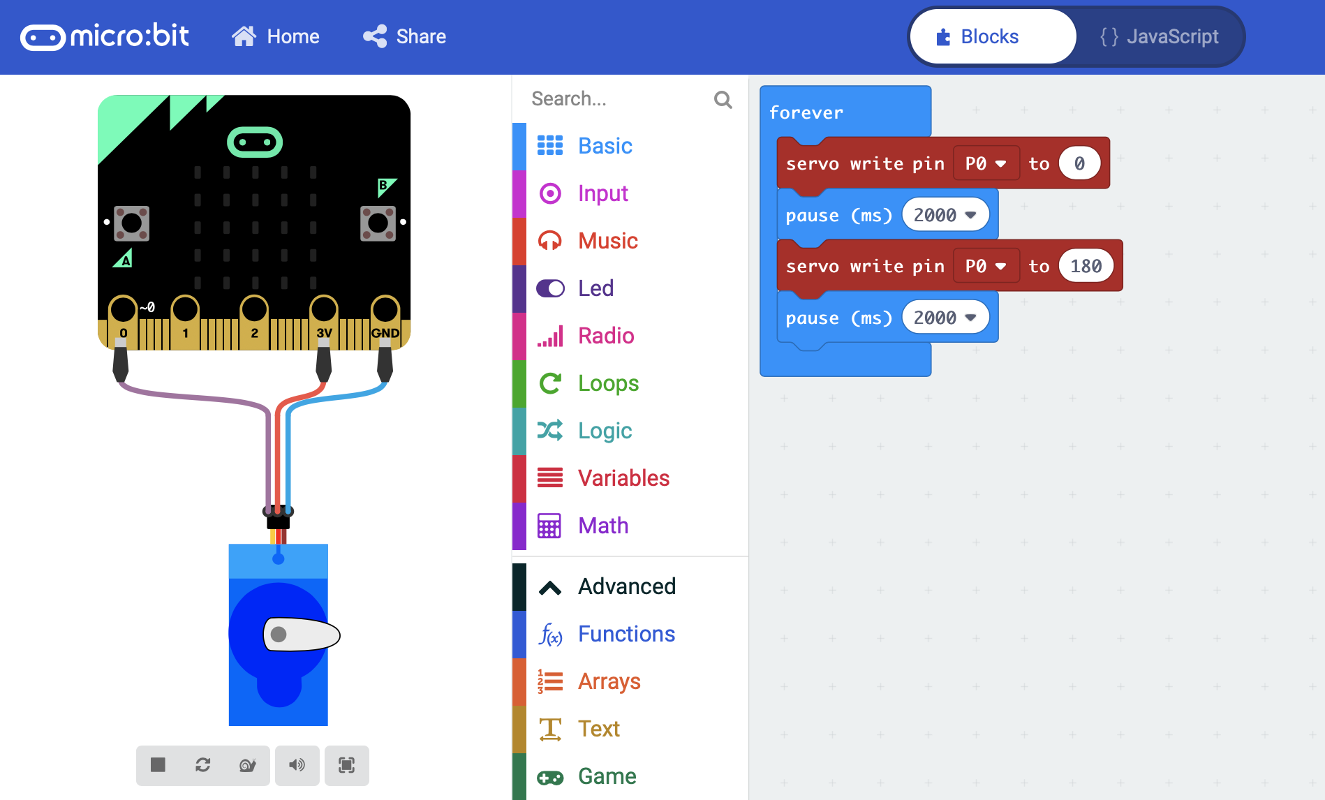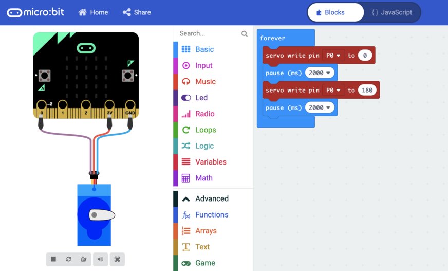 Frekvencia impulzov privádzaných na oranžový vodič je 50 Hz. Uhol natočenia sa ovláda šírkou pozitívneho pinu. Napríklad u modelárskeho serva SG90 je šírka pulzu 500 až 2400 μs a tejto hodnote zadpovedá uhol natočenia 0°až 180. Na prvý pohľad to znie zložito, ale vďaka knižnici integrovanej do vývojového prostredia je ovládanie servomotorov veľmi jednoduché. Servomotor má väčší odber, než je schopná doska dodať pri napájaní cez USB, preto je potrebné napájať dosku z batérií. Oranžový vodič je vo vnútri serva pripojený na riadiacu elektroniku, nemá veľký prúdový odber, takže ho môžete pripojiť priamo na port. Pre servo pripojené na port P0 sa graficky zobrazuje emulácia jeho natáčania.