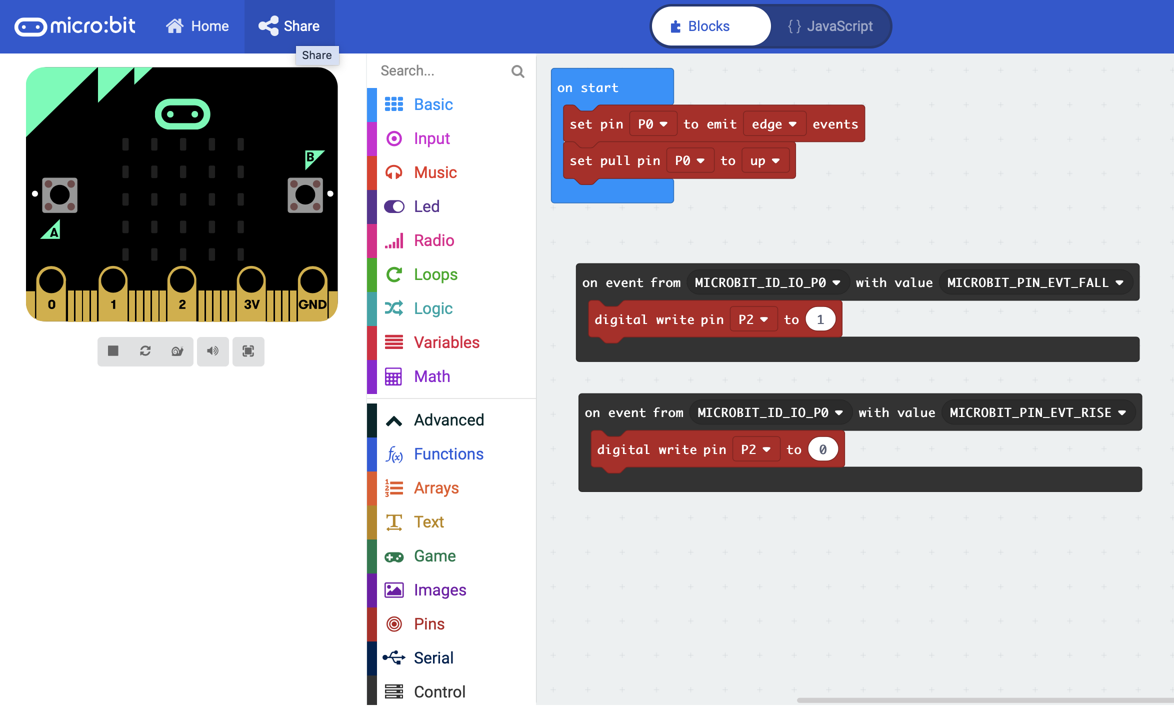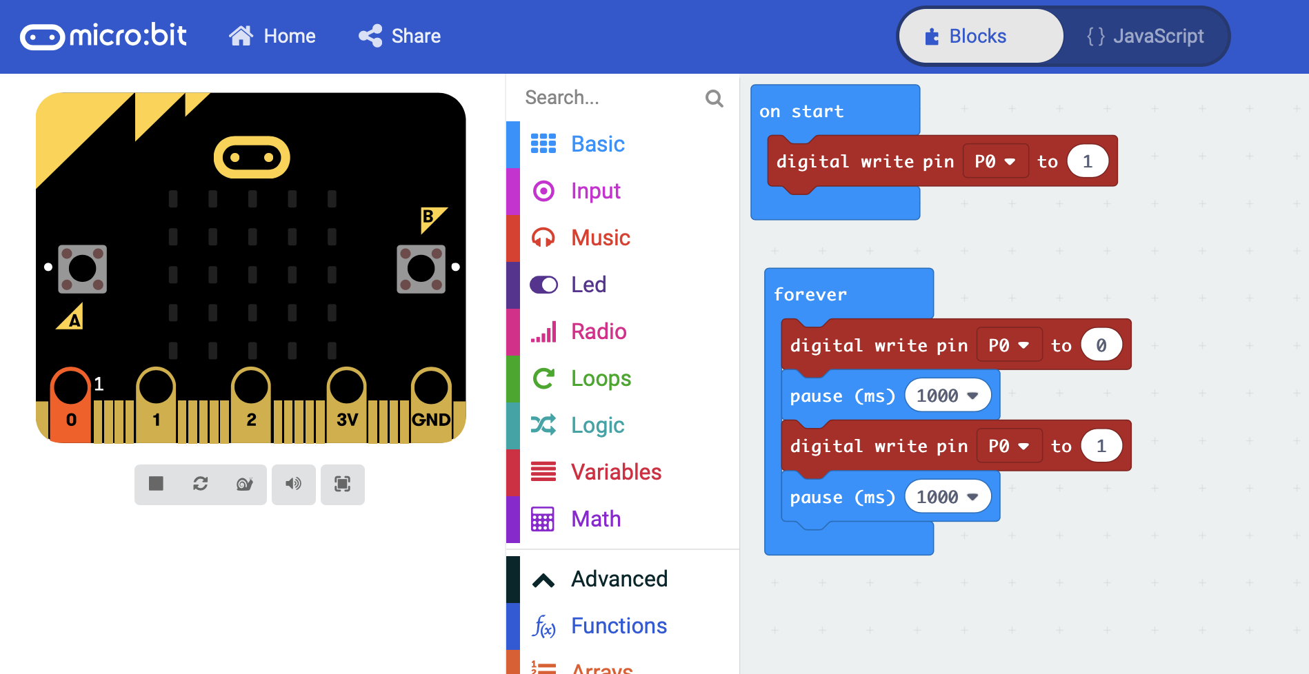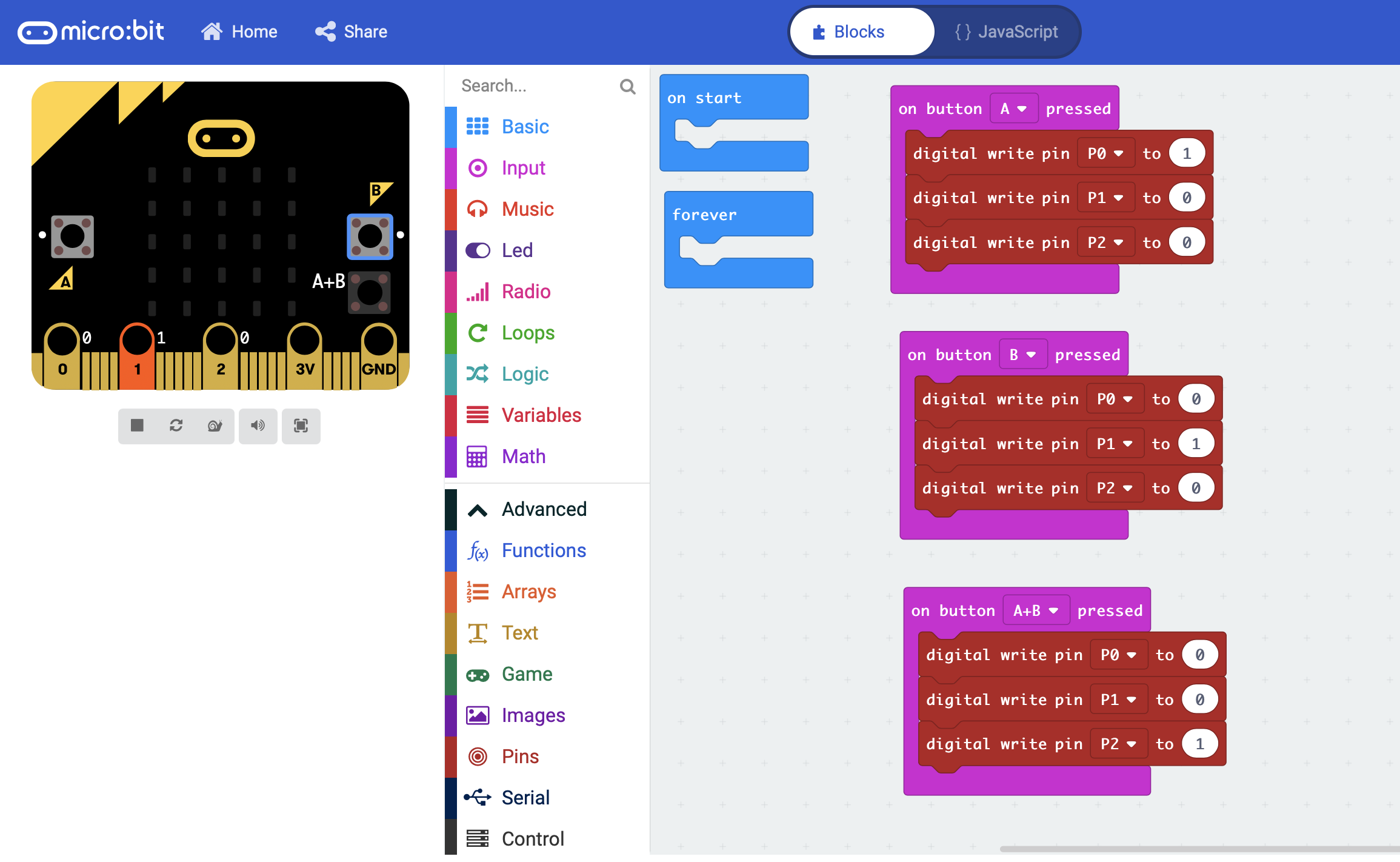 V prvom príklade ukážeme rozsvietenie RGB LED, ktorej tri vývody sú pripojené k portom P0, P1 a P2. Farba LED sa nastaví podľa toho, či používateľ stlačil tlačidlo A, tlačidlo B, alebo obidva tlačidlá súčasne. Všimnite si, že hlavná slučka, čiže cyklus forever neobsahuje žiadny kód, všetko sa odohráva v obsluhe udalostí zatlačenia tlačidiel input.onButtonPressed.