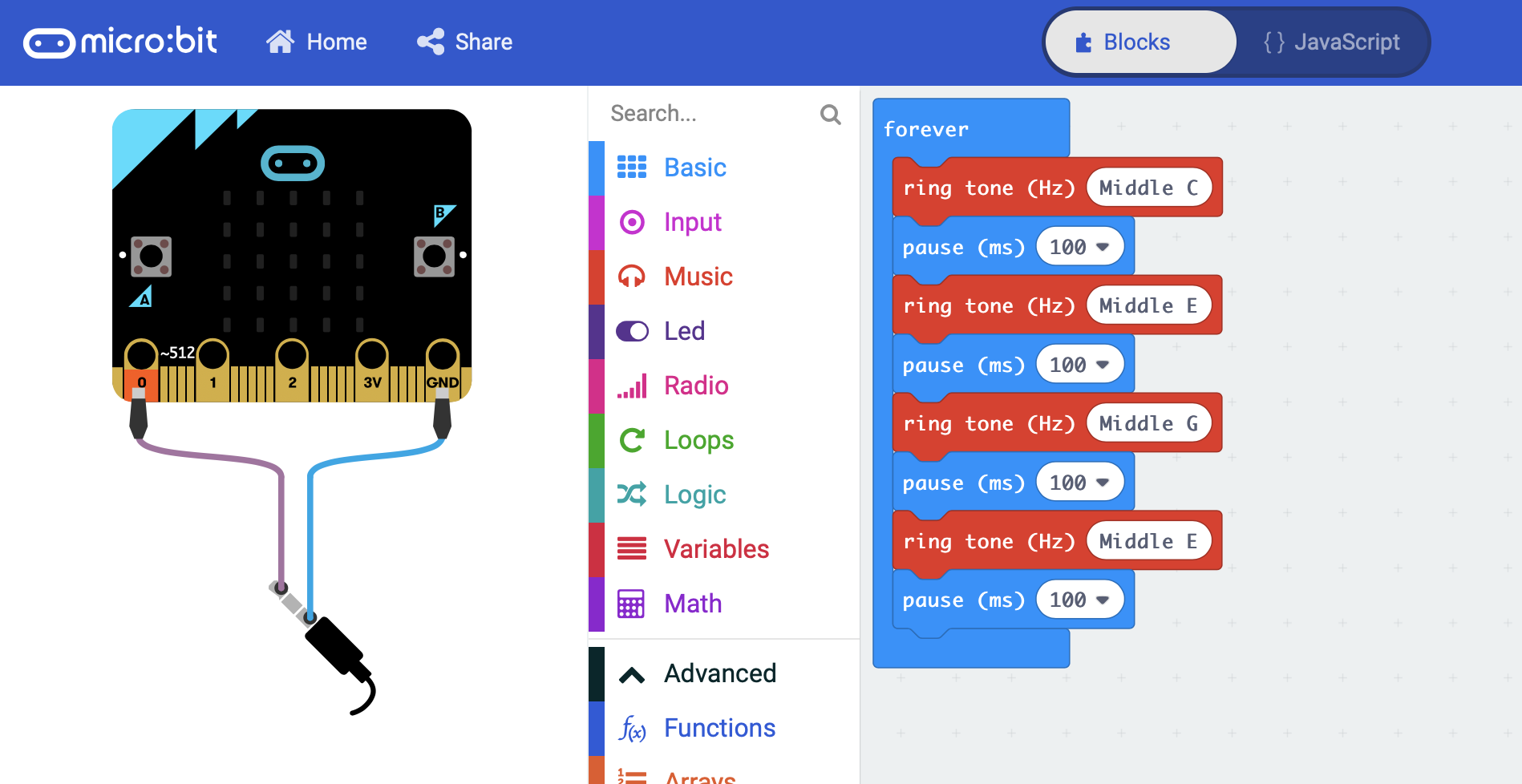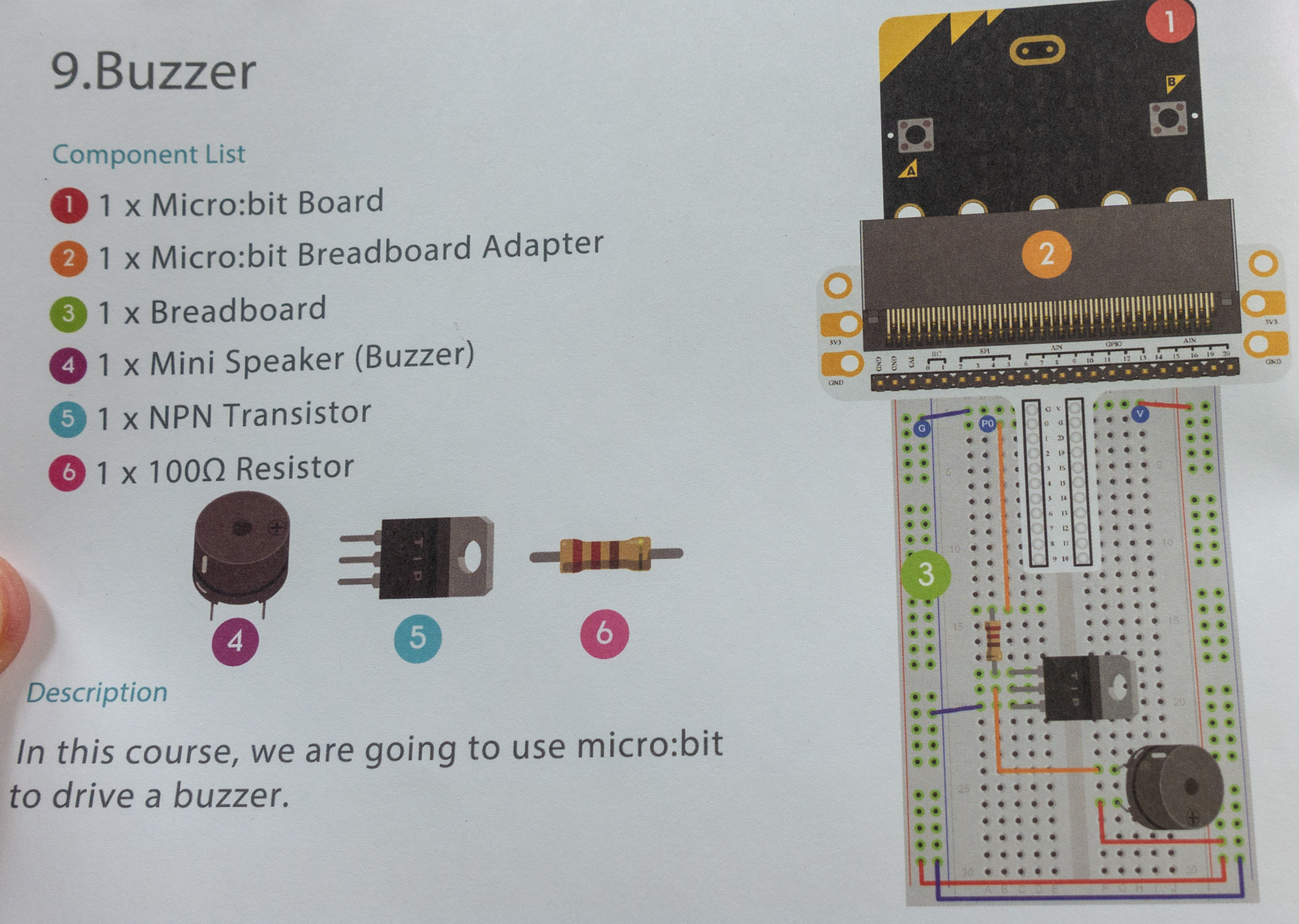 Okrem obsluhy udalostí, ukážeme aj ďalšie hardvérové možnosti. V nasledujúcom príklade je generovanie zvuku. Vo videu si všimnite ako sa interaktívne dajú nastaviť tóny buď podľa hudobnej stupnice, klaviatúry klavíra, alebo zadaním frekvencie. Nakoľko bzučiak má väčší prúdový odber, nepripojíme ho priamo na port P0, ale cez NPN tranzistor.