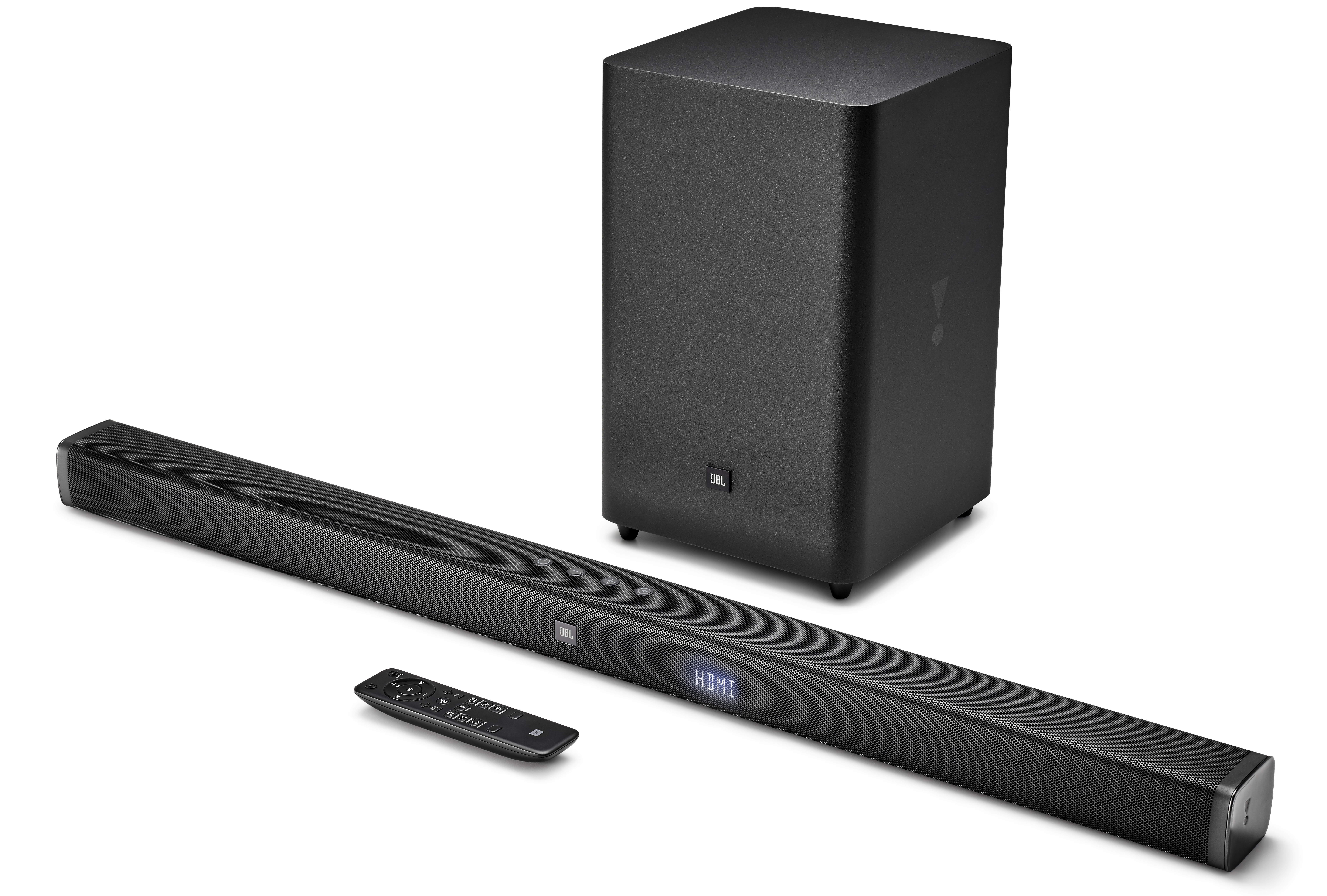 JBL Bar 2.1 má subwoofer s vonkajším objemom 19 litrov. Reproduktorová skriňa s objemom 50 alebo 100 litrov by z 200 W elektrického výkonu, samozrejme, vyžiarila podstatne vyšší akustický výkon. Párovanie subwoofera so soundbarom je automatické. Soundbar má 5-znakový informačný displej decentne ukrytý pod prednou mriežkou. Ak treba zobraziť dlhší text, je to vyriešené rotovaním. V zadnej časti je optický a metalický zvukový vstup, dva konektory HDMI (jeden s podporou ARC) a konektor USB na pripojenie kľúča s multimediálnymi súbormi.