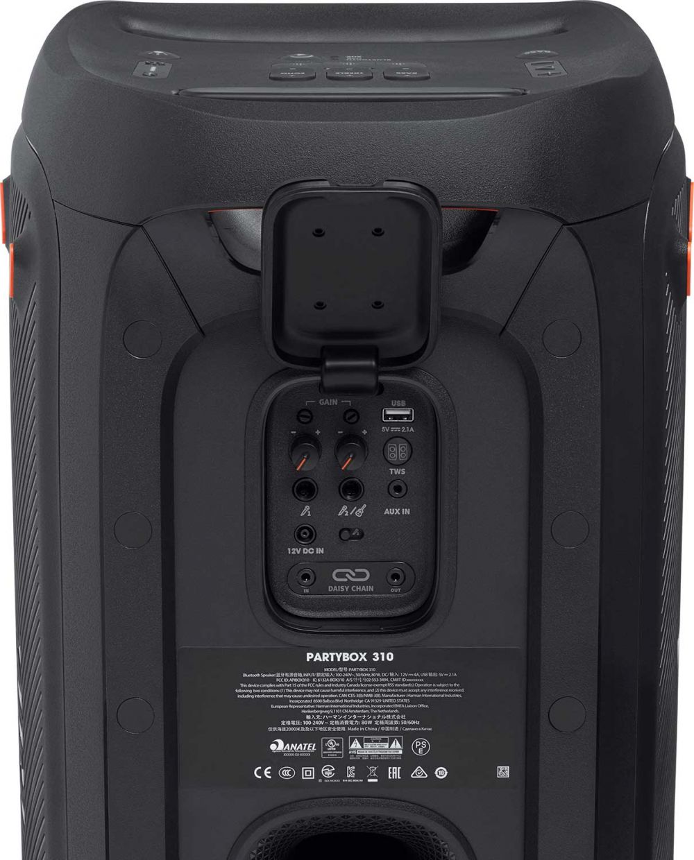 Oproti nižším modelom má PartyBox 310 rozšírené možnosti využitia vďaka dvojici audiovstupov, do ktorých môžete pripojiť externý mikrofón, prípadne gitaru alebo iný elektronický nástroj a oživiť tak párty svojím spevom, karaoke alebo svojím umením hry na hudobnom nástroji. JBL má na tento účel v ponuke káblový mikrofón PBM100 ktorý dostanete za 39,90 EUR. Dvojica stredobasových meničov priemerom 176 mm je vybavená svetelnými efektovými obručami, ktoré dokážu vyčariť rôznofarebné svetelné efekty. Tie si môžete podrobnejšie nastaviť v aplikácii, ale môžete ich takisto jednoducho prepínať tlačidlom na vrchnej strane prístroja.
