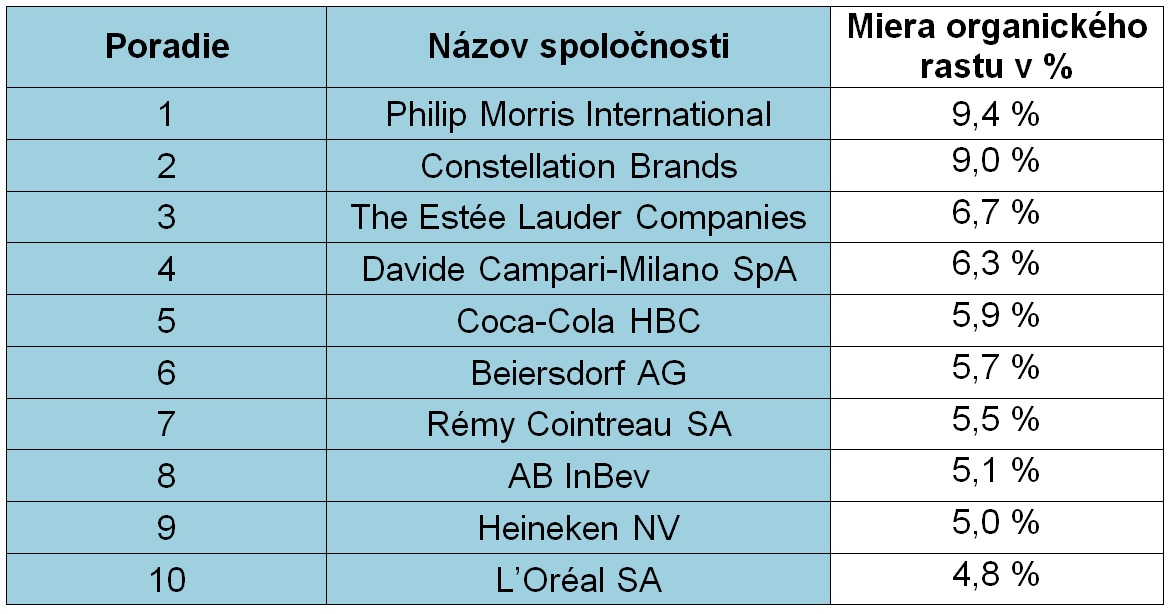 Z výsledkov štúdie KPMG Organic Growth Barometer 2018 vyplynulo, že za predchádzajúci finančný rok sa priemerná ročná miera rastu medzi spoločnosťami v sektore spotrebného tovaru mierne znížila - o 0,5 % na aktuálnych 2,5 %. Rast zaznamenali iba luxusné, prémiové produkty v segmentoch potravín, nápojov a krásy. Potvrdzuje to aj rebríček firiem s najvyšším organickým rastom – v prvej trojici sa umiestnili Phillip Morris International, predajca prémiových vín, pív a destilátov Constellation Brands a prestížna kozmetická značka Estée Lauder.