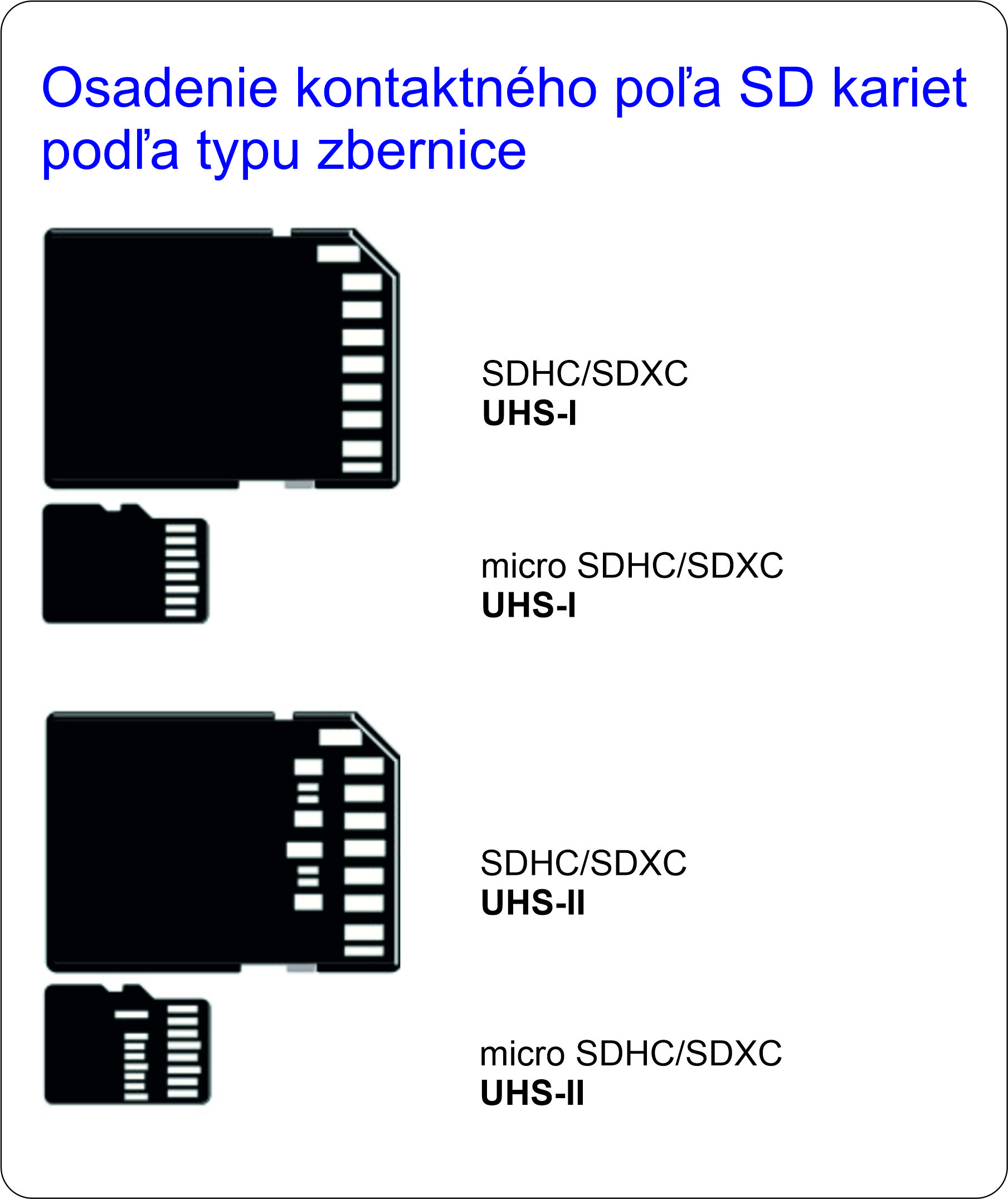 Čo sa týka štandardov pre SD karty, v tých je už dlhší čas minimálne rovnaký zmätok ako v štandardoch USB. Preto sa niet čo čudovať, že väčšina používateľov ani len netuší, akú kartu do svojho zariadenia potrebuje. Počas vývoja kariet sa postupne objavovali nové a nové označenia. SD karty v súčasnosti využívajú dva typy zbernice, označené UHS I alebo UHS II/UHS III. Navonok ich poznáte podľa kontaktného poľa, ktoré pri zbernici UHS I využíva jeden rad kontaktov a v UHS II dva rady. To je spoločné pre veľkosti SD aj microSD. UHS II je, samozrejme, rýchlejšia zbernica, ale na jej využitie je potrebná podpora zariadenia (kamery). Výhodné však je, že zbernica je úplne kompatibilná s UHS I, takže karty UHS II môžete bez problémov využívať vo všetkých zariadeniach, v zariadeniach so zbernicou UHS I však bude ich prínos minimálny. No to neznamená, že vôbec nemá zmysel ich používať. Ak máte napríklad kameru iba s podporou kariet UHS I, k PC si môžete dokúpiť čítačku na UHS II, čím využijete rýchlosť karty aspoň pri sťahovaní materiálu do PC naplno. Okrem označenia zbernice je na kartách ešte označenie rýchlostnej triedy. Na starších kartách sa používali označenia ako Class 2 až Class 10, ktoré však bežnému používateľovi veľa nepovedia. Potom prišlo označenie rýchlosti U1 alebo U3. Pre tvorcov videa je však najužitočnejšie označenie rýchlostných tried pre video V6, V10, V 30, V60 a V90, podľa ktorých sa dá lepšie určiť, či vám bude karta rýchlosťou vyhovovať. Vo všeobecnosti karty V30 sú vhodné pre zariadenia so záznamom full HD alebo so záznamom 4K s nízkym dátovým tokom do 100 Mb/s, typicky smartfóny alebo akčné kamery. Niektoré zvládnu aj záznam s dátovým tokom 150 Mb/s, ale na to sú lepšie karty s vyššou špecifikáciou V60. Niekomu by sa mohlo zdať, že predsa aj karty V30 by mali zvládnuť dátové toky 400 Mb/s, čo je v prepočte 50 MB/s a takéto karty to obvykle zvládajú. Problém pri zápise videa je však v tom, že karta musí dokázať udržať takýto dátový tok stabilne pri zápise aj čítaní bez akéhokoľvek poklesu, ktorý by znehodnotil záznam. Preto sú pre niektoré dátové toky videa odporúčané karty v určitej rýchlostnej kategórii, ktorá garantuje udržanie potrebného dátového toku za všetkých podmienok.