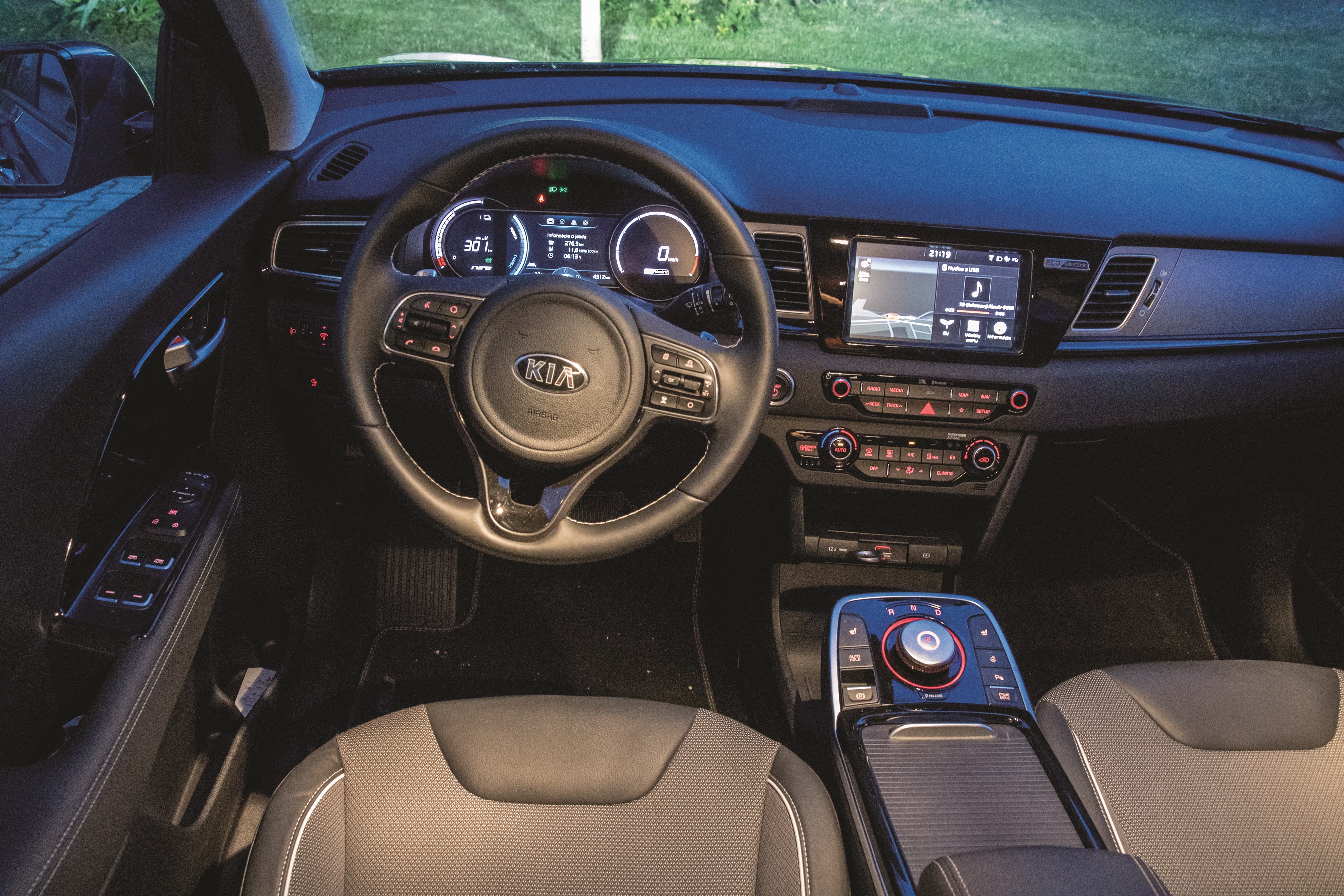Z koncernovej trojice elektrických SUV ( Hyundai Kona EV, Kia e-Soul a e-Niro) je e-Niro najväčším a najlepšie to poznáte na priestornosti kabíny aj kufra. Ako som spomínal na začiatku, technológia pohonu je zdieľaná všetkými troma modelmi, takže rovnaká je batéria, motor, aj možnosti nabíjania a aj v testoch boli výsledky veľmi podobné. Napriek tomu že podobné prvky by sa našli, kabína je iná ako u e-Soulu. Prístrojový panel je tiež displejový, má však odlišnú grafiku. Iný je aj centrálny displej ktorý je rovnaký ako u Plug-in hybridnej verzie, takže 8“ dotykový a nie je tu hlasové ovládanie. Vzhladom k väčšiemu priestoru je ináč riešená stredová konzola. Je vyššia s veľkým úložným priestorom vpredu a veľkou schránkou so zasúvacou roletkou za voličom jazdných režimov. Ten je rovnaký ako u e-Soul aj s ovládačmi okolo, sú však ináč usporiadané.