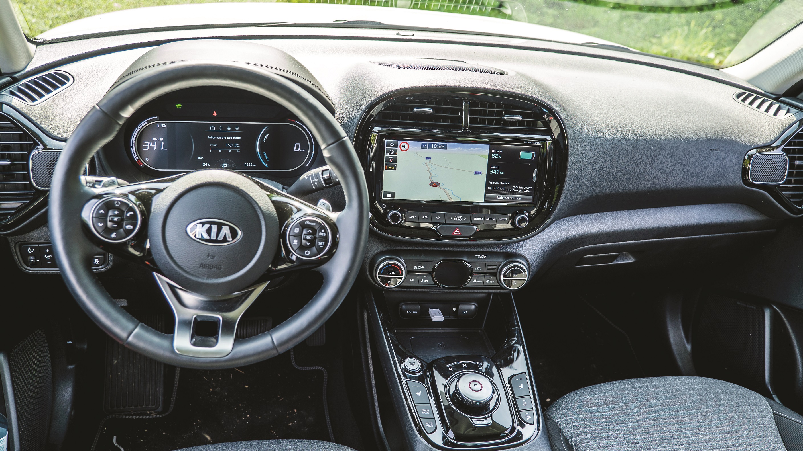 Prístrojový panel je tvorený farebnými displejmi, nejde však o virtuálny kokpit, možnosti konfigurácie sa ale obmedzujú na stredné okno kde si môžete meniť zobrazenie palubného počítača, navigácie a asistenčných systémov a môžete tu nastavovať parametre vozidla. Pozitívom je že displej má matný povrch, takže nemá tendenciu k odrazom. Prístrojový panel vľavo ukazuje graficky stav nabitia batérie a veľkým číslom predpokladaný dojazd, vpravo zase grafiku výkonu a rýchlosti a číselnú hodnotu rýchlomeru. Priehľadový displej vozidlo nemá. Ovládacie tlačidlá na volante sú združené v dvoch kruhových pozíciách. Tlačidlá majú pomerne veľký zdvih a vďaka tomu že sú hneď pri sebe akosi som sa s nimi nevedel zžiť a občas som trafil niečo iné. Nie je to nič tragické ale Niro to má vyriešené lepšie. Volič jazdných režimom je kruhový s tlačidlom P v strede a je spolu s ďalšími ovládačmi umiestnený na strednej konzole. Nájdete tu aj tlačidlá vyhrievania volantu a sedadiel, mimochodom, vyhrievané sú aj zadné, jazdných módov, či Auto Hold a parkovacej elektrickej brzdy. Pred voličom je tradične miesto pre mobilný telefón s bezdrôtovým nabíjaní, 12V zásuvkou a 2 USB vstupmi, jeden pre nabíjanie. Klimatizácia je jedno-zónová avšak s možnosťou cielenia iba na vodiča, ak sa vo vozidla veziete sám.