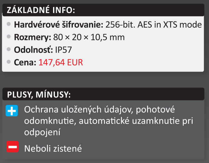 » Najväčšia nevýhoda kľúčov USB je v tom, že ich môžeme ľahko stratiť, prípadne sa stanú predmetom záujmu zlodeja. Materiálna strata, ktorú v takomto prípade predstavuje hodnota hardvéru, je zanedbateľná, ale škoda vyplývajúca z toho, že sa vaše údaje dostanú do nepovolaných rúk, môže byť nevyčísliteľná. Riešenie ponúka Kingston v podobe kľúča USB, na ktorom je číselná klávesnica umožňujúca zadanie PIN kódu na odomknutie dát uložených na disku v zašifrovanej podobe. Využíva sa technológia šifrovania 256-bitovým algoritmom AES. V kľúči je nabíjateľná batéria, takže PIN kód môžete zadať ešte pred zasunutím kľúča do počítača. Je to výhodné hlavne vtedy, ak máte port USB na ťažko prístupnom mieste. Pri prvom použití zadáte výrobcom prednastavený kód 11223344. Po odomknutí nájdete na kľúči používateľský manuál. Prvý krok je, samozrejme, zmena PIN kódu. Môže mať 7 – 15 číslic, pričom nesmú byť všetky rovnaké. Kľúčom nemôže byť ani usporiadaná postupka typu 1234567. Keďže na klávesoch sú aj písmená po trojiciach, odporúčame zadať číslo na základe slovného hesla. Napríklad slovo kingston bude 5 (jkl) 4 (ghi) 6 (mno) 4 (ghi) 7 (pqrs) 8 (tuv) 6 (mno) 6 (mno). Nový PIN sa zadáva po odomknutí zariadenia a dvojitom zatlačení tlačidla so symbolom kľúča. Potom rovnakým postupom nový PIN potvrdíte. Po odpojení od počítača sa kľúč USB automaticky uzamkne. Výrobca pamätal aj na prípadnú možnosť uhádnutia PIN kódu skúšaním najpravdepodobnejších kombinácií, pri ktorom by príslušná osoba použila napríklad číslice z dátumu narodenia a podobne. Ak sa 10-krát po sebe zadá zlý PIN kód, kľúč USB sa automaticky naformátuje.