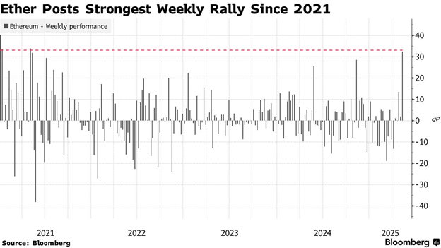 Druhá najväčšia kryptomena je Ethereum, ktoré má v porovnaní s Bitcoinom v súčasnosti asi pätinovú trhovú kapitalizáciu. Posledné roky Ethereum za Bitcoinom výrazne zaostával svojou výkonnosťou aj záujmom investorov, čo sa však v ostatných mesiacoch mení. Len za posledný týždeň Ethereum totiž rástlo o zhruba 33 %, čo je aj na pomery kryptomien relatívne vysoká hodnota, ktorá predstavuje pre Ethereum najväčší týždenný rast od roku 2021 (viď graf)