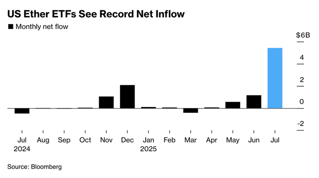 konkurencieschopným. Posledný update siete Ethereum Pectra by mal priniesť zníženie transakčných nákladov, zlepšenie efektivity a podobne. Rastu ceny tiež pomáha aj veľký prílev prostriedkov do amerických spotových ETF, kde od začiatku roka pritieklo takmer 7 miliárd USD, veľká časť z toho posledný mesiac (viď graf).
