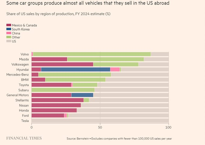 Podľa údajov z Financial Times najviac ohrozené spoločnosti, ktoré predávajú importované automobily, sú spoločnosti ako je Volvo, Mazda a Volkswagen, ktoré odhadom v roku 2024 importovali približne 75-80 % zo svojich tržieb. Výraznejšie to poškodí tiež aj americké automobilky, ktoré majú svoju výrobu aj v zahraničí, primárne v Mexiku alebo Kanade.