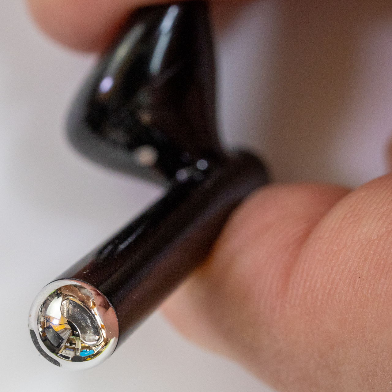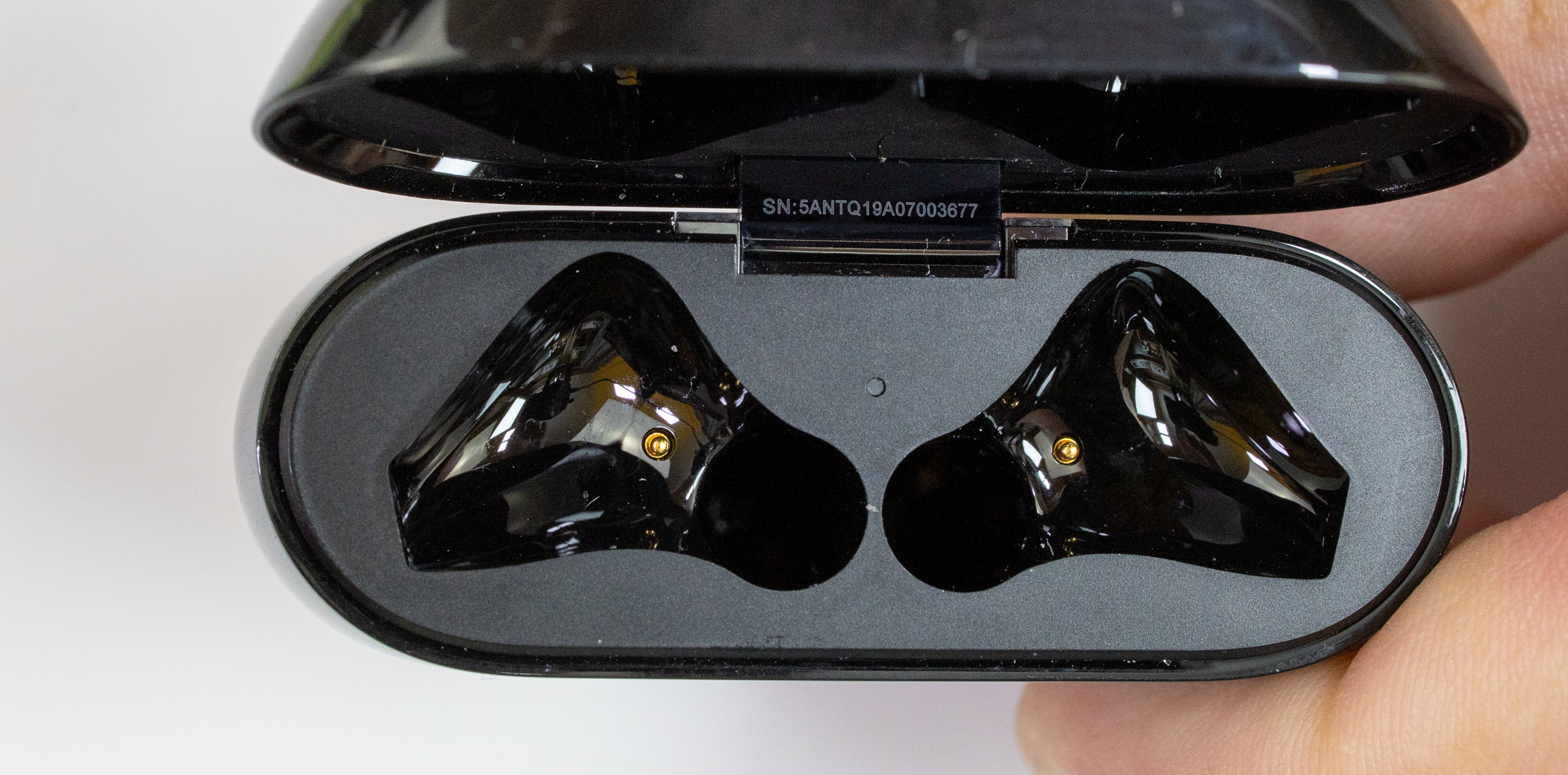 Začnem puzdrom, v ktorom sú tvarované otvory na vloženie slúchadiel. Slúchadlá sú v puzdre fixované magneticky a nabíjajú sa pomocou dvojice kontaktov. Jeden je na spodku tvarovanej časti, ktorá sa vkladá do ucha a druhým kontaktom je metalický diel na konci krátkych valčekov, pod ktorým je zároveň aj otvor pre mikrofón.