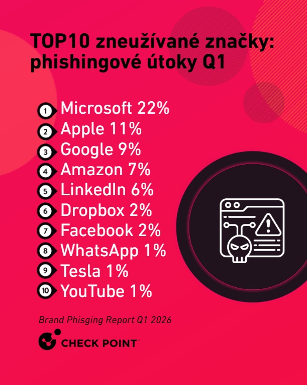 V prvom kvartáli 2026 tvorili podvodné maily so značkou Microsoft 22 percent globálnych phishingových útokov. Zneužívanie značky Apple predstavuje 11 % phishingových útokov a trojicu brand phishingovej štatistiky uzatvára Google (9 %). Dlhodobé masívne zneužívanie značiek Microsoft, Apple a Google zároveň ukazuje na ich silné pozície v oblastiach autentifikácie, produktivity a správy digitálnej identity.