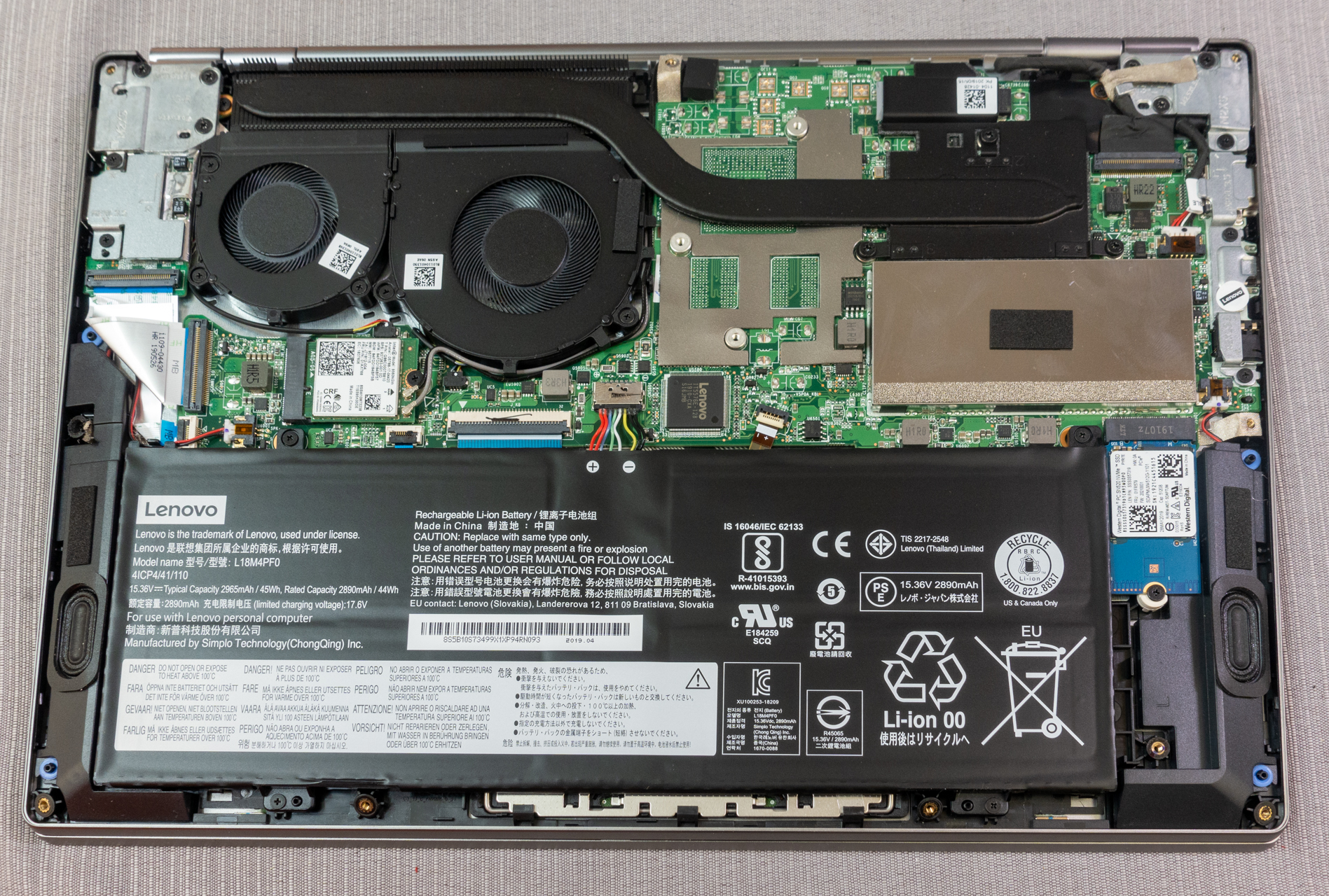 Procesor Intel Core i5-8265U je schopný dodať výkon dostatočný aj pre stredne náročné grafické aplikácie na editovanie fotografií, či FullHD videa, krátkodobo sa vie pretaktovať až na 3.9 GHz. Samozrejme výkon po dlhšiu dobu, napríklad pri rendrovaní videa, či náročných analýzach v Exceli je podmienený účinnosťou chladenia. To zabezpečujú dva pomerne tiché ventilátory a v neposlednom rade aj prestup tepla cez kovový panel okolo klávesnice. Integrovaná grafická karta a full HD rozlíšenie, ktoré je pri uhlopriečke 13.3 palcov viac než dostatočné, je dobrým kompromisom medzi grafickým výkonom a výdržou na batériu. Tá je reálne 6 – 8 hodín, podľa záťaže a nastaveného jasu podsvietenia. Štandardne je osadený „krátky“ 42 mm M.2 modul polovodičového disku od Western Digital s kapacitu 512 GB. Slot v notebooku umožňuje vložiť aj dlhšie 60 a 80 mm moduly, takže v prípade potreby sa dá kapacita disku rozšíriť. Spodná stena je upevnená pomocou štandardných skrutiek, takže jej odobratie a rozšírenie kapacity RAM, či disku je z mechanického hľadiska bezproblémové. Samozrejme pri výmene disku musíte preniesť na nový disk aj operačný systém.