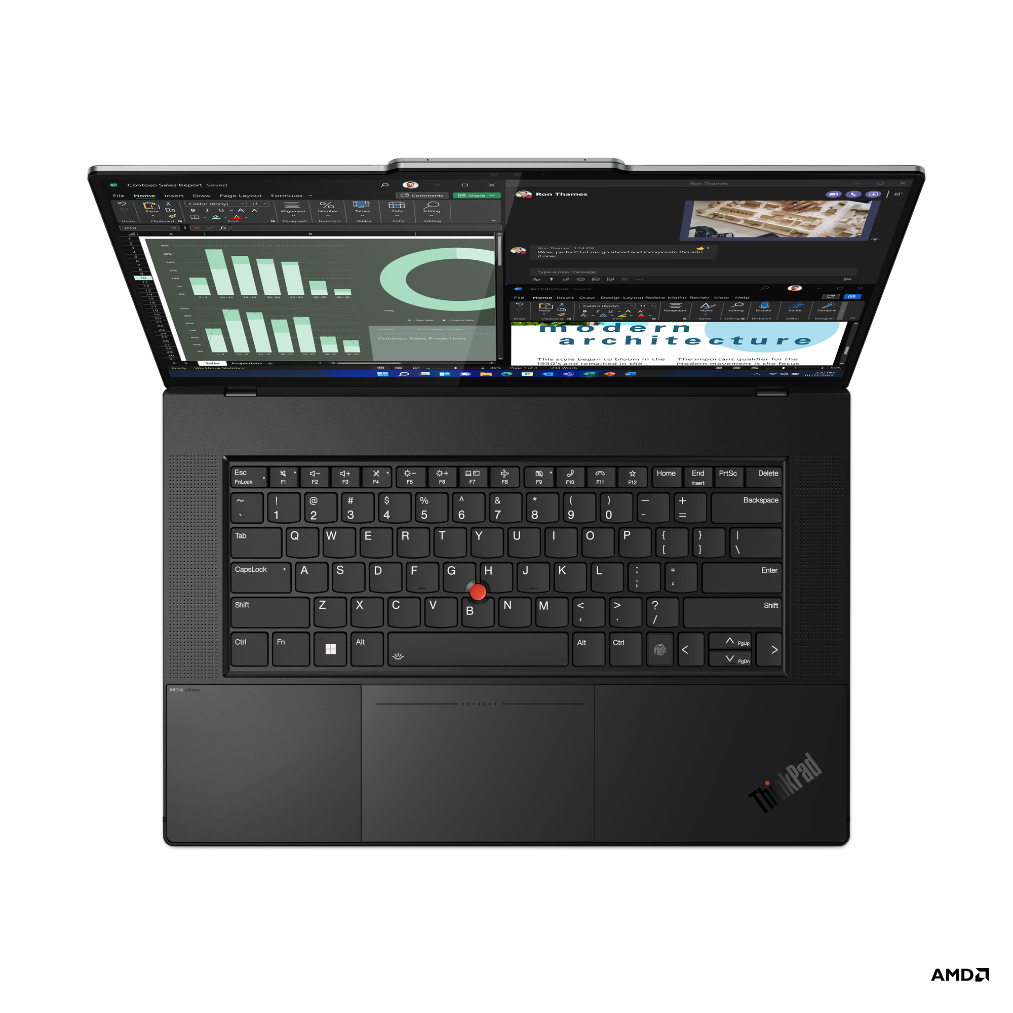 Notebook je vyrobený z recyklovaného hliníka a dodávaný v bezodpadovom, kompostovateľnom balení. Konfigurácia je jedna z najvyšších a využíva 16-vláknový procesor Ryzen 9 Pro 7940HS, 64 GB RAM LPDDR5, 2 TB SSD, Windows 11 Pro a grafiku AMD Radeon RX 6550M 4 GB, ktorá spolupracuje so 4K+ dotykovým displejom OLED s rozlíšením až 3840 × 2400 bodov. Tenké rámiky obklopujú displej s pomerom strán 16:10 a mierny výstupok navrchu obsahuje webovú kameru, ktorá má namiesto obvyklého posuvného uzáveru Lenovo prepínač ochrany súkromia 0 (kláves F9). Webová kamera s rozpoznávaním tváre nie je jediný spôsob, ako preskočiť heslá s Windows Hello, nájdete tu aj čítačku odtlačkov prstov v dolnom rade klávesnice. Zariadenie tak ako väčšina ThinkPadov prešlo testami MIL-STD 810H na cestovné riziká ako náraz, vibrácie a extrémne teploty. O robustnosti konštrukcie svedčí aj to, že ak uchopíte roh displeja alebo stlačíte klávesnicu, nezaznamenáte takmer žiadny ohyb.