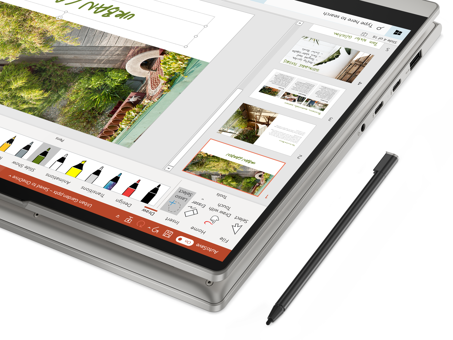 Dotykový displej má vysoké rozlíšenie, čo vám dáva na výber, či necháte štandardne nastavenú mierku zobrazovania 300 %, alebo ak máte dobrý zrak, mierku zmenšíte, aby ste mali na obrazovke zobrazených viac informácií. Po preklopení displeja máte k dispozícii tablet s veľkým displejom, na ktorý môžete pohodlne písať a kresliť, či už ho máte položený na stole, alebo na kolenách. Na dlhšie držanie v rukách je konvertibilné zariadenie so 14-palcovým displejom predsa len trochu priťažké. Možno vás osloví aj niektorá z medzipolôh konvertibilného zariadenia – stojan alebo stan, ktoré sú vhodné na prezentovanie či multimediálnu zábavu. Displej vďaka jasu 500 nitov spĺňa parametre HDR400 Dolby Vision. Deklarované pokrytie 90 % farebného priestoru DCI-P3 je záruka verného podania farieb. Integrovaná grafika Intel Iris Xe Graphics prináša v porovnaní s predchádzajúcou 10. generáciou výrazný nárast grafického výkonu. Externý monitor, prípadne projektor môžete pripojiť cez port USB-C s podporou technológie Thunderbolt 4.