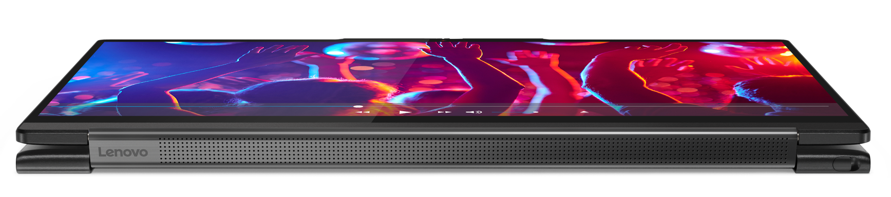 Klávesnica je, samozrejme, podsvietená a napriek nízkemu zdvihu klávesov umožňuje rýchle a presné písanie. Klávesniciam modelov ThinkPad však konkurovať nemôže. Zvuk je vďaka soundbaru, ktorý je súčasť kĺbu, a technológii Dolby Atmos nadštandardný. Soundbar dopĺňajú dva reproduktory v prednej časti spodnej steny. Inštalované reproduktory majú celkový výkon 2 watty.