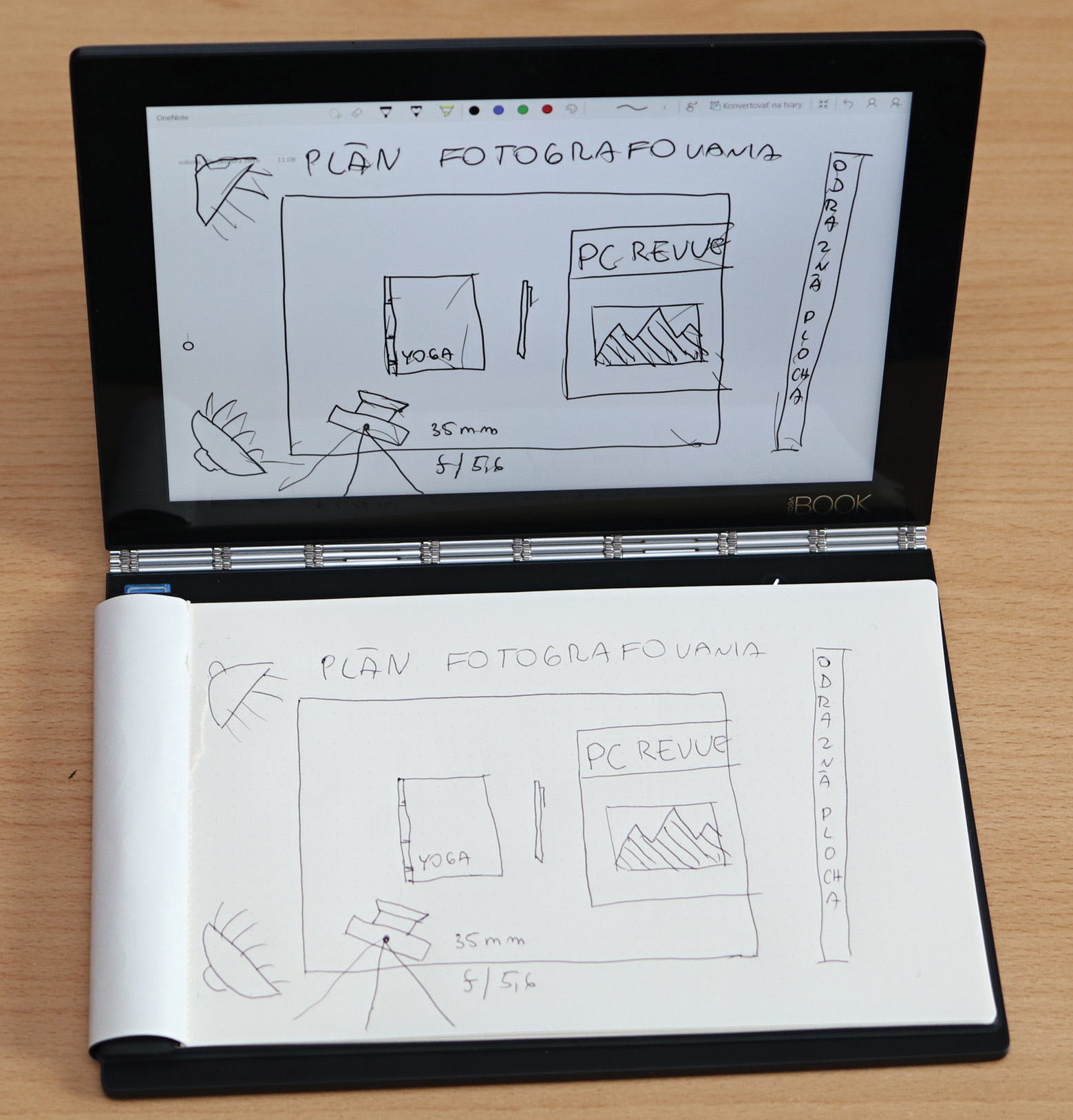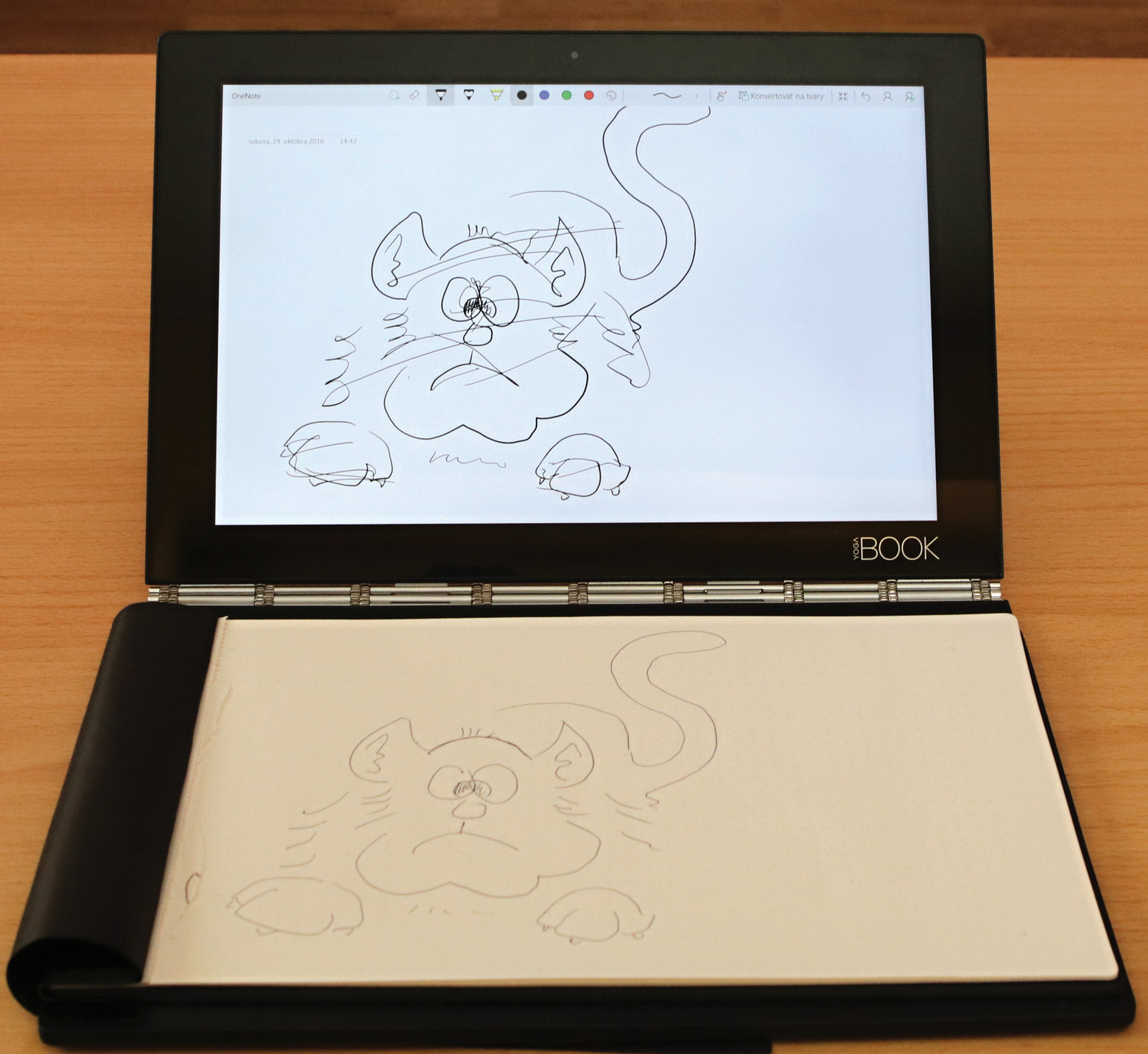 Výhodou tejto technológie je to, že taká vysokofrekvenčná energia z podložky, ako aj signál vysielaný perom, môže prechádzať rôznymi nevodivými materiálmi, ako je plast či papier, aj cez hrúbku niekoľko milimetrov. Preto na zariadení Yoga Book môžete písať a kresliť nielen na akýkoľvek papier, ale aj na tenký blok. Takýto blok s možnosťou magnetického prichytenia na snímaciu plochu, označený Book Pad, je súčasťou dodávky. Náhradné papiere sa buď dajú kúpiť v blokoch po 20 listov, alebo ak podrobnejšie preskúmate konštrukciu bloku, stačí do akéhokoľvek papiera vhodného rozmeru urobiť dve dierky a vložiť do originálneho bloku.