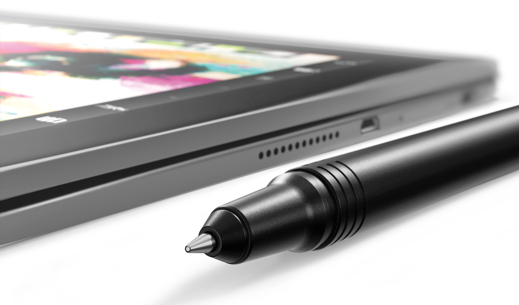 Súčasťou dodávky je aj elektronické pero nazývané Real Pen, dve náhradné náplne a náhradný hrot. Názov „reálne pero“ je v tomto prípade namieste, v pere je skutočne atramentová náplň s guľôčkou, takže ním môžete písať aj na papier. Elektronické pero využíva princíp Wacom EMR, teda elektromagnetickú rezonanciu, takže nepotrebuje batériu. Technológia EMR funguje tak, že sa v rýchlom slede prepínajú dva prevádzkové režimy. V prvom plocha na zariadení vytvára magnetické pole a vysiela na vysokej frekvencii energiu, ktorá sa ukladá do miniatúrneho kondenzátora v pere. V druhom režime plocha prestane vysielať vysokofrekvenčnú energiu, prepne sa do režimu snímania a sníma polohu pera nad snímačom. Pero je teraz vysielač a plocha zmeria úroveň sily signálu na niekoľkých miestach a následnými výpočtami presne určí, kde sa pero nachádza, či je hrot pritlačený a ako intenzívne je pritlačený. Real Pen rozpoznáva až 2048 úrovní tlaku, takže zachytí aj najjemnejšie nuansy každej línie.