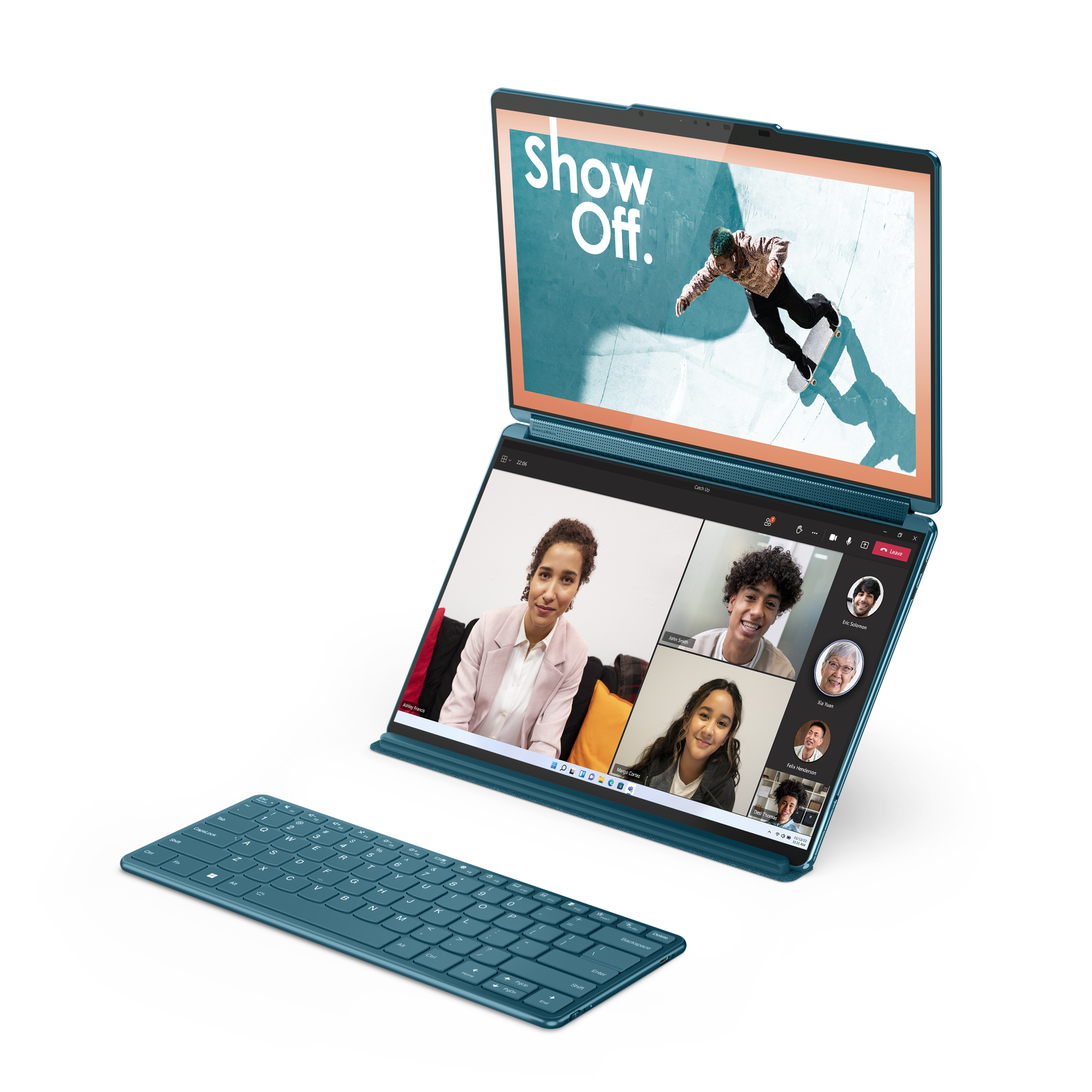 Na vážnejšie písanie je lepšie pripojiť bluetoothovú klávesnicu na dolný displej, uchytí sa magneticky. Pri zarovnaní s horným okrajom dolná polovica displeja zobrazí virtuálny touchpad. Pri zarovnaní s dolným okrajom horná polovica zobrazí váš kalendár Outlook a spravodajský kanál MSN (čo Lenovo nazýva Widget Bar). Pred zatvorením notebooku musíte odstrániť klávesnicu, inak poškodíte displej alebo pánt.