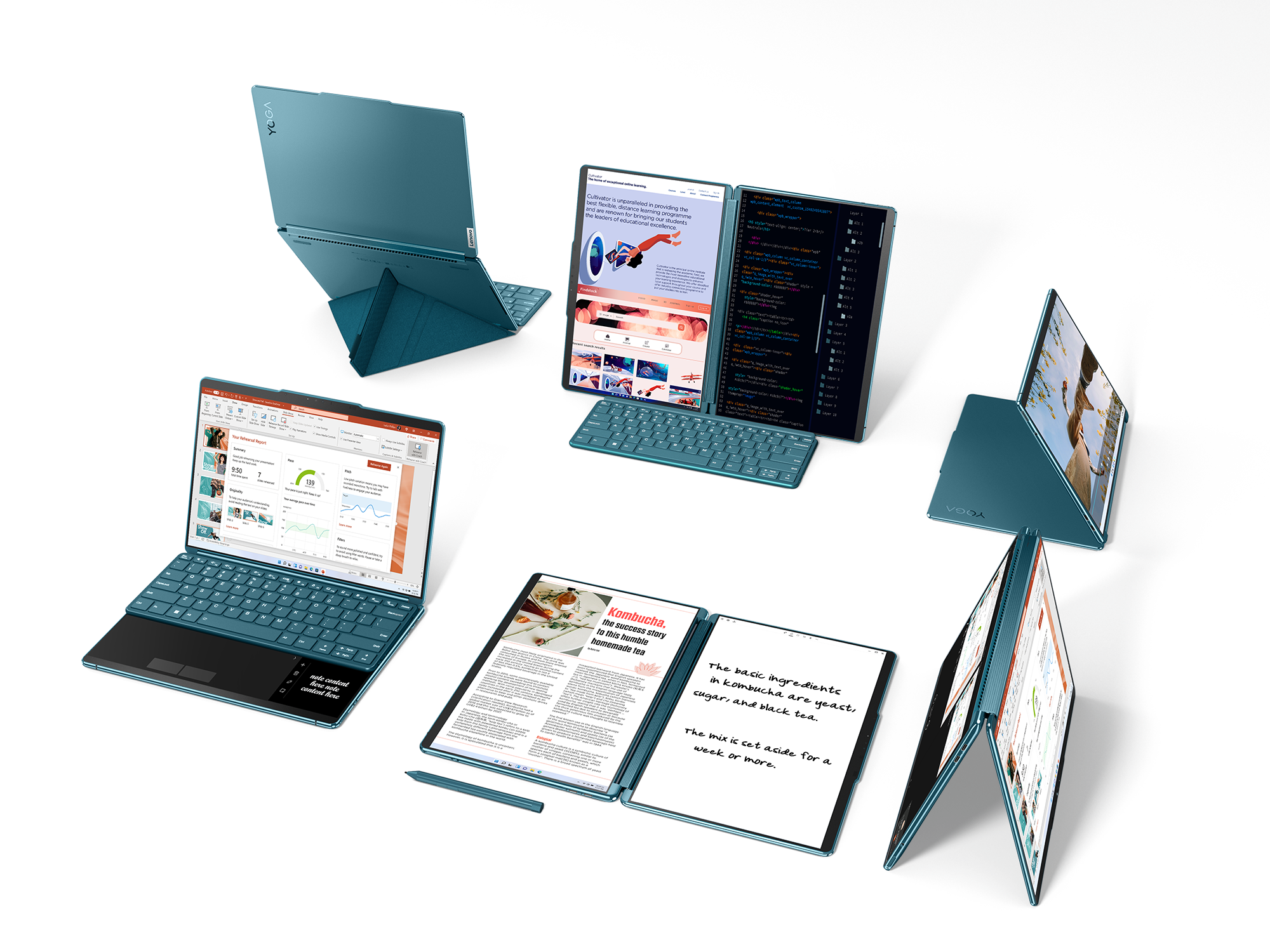 Ak chcete používať oba displeje, môžete zariadenie otvoriť rovno ako časopis, používať bluetoothovú klávesnicu a myš alebo písať perom v aplikácii Lenovo Smart Note (ktorá môže exportovať poznámky vo formáte PDF, PNG alebo do Microsoft OneNote). Podľa očakávania môžete ťahať, zmenšovať a usporadúvať okná aplikácií na dvoch obrazovkách, ako sa vám páči. Potiahnutím vrchu okna sa zobrazí malé vyskakovacie okno, ktoré ponúka presunutie do druhého displeja alebo pridanie do dvoj-, troj- alebo štvoraplikačného rozloženia. Klepnutím dovnútra okna piatimi prstami (v skutočnosti to nie je také jednoduché ako klepnutie tromi alebo ôsmimi) sa rozšíri alebo rozleje cez oba displeje. Možno najpôsobivejší trik Yoga Book je cestovný obal, ktorý obklopuje klávesnicu a skladá sa ako origami do akéhosi pyramídového tvaru, ktorý podopiera dva displeje buď v portrétnom, alebo širokom režime, s hrebeňom alebo výčnelkom na zabezpečenie spodného okraja. Klávesnicu môžete zapojiť pod hrebeň alebo ju odpojiť a presunúť bližšie k sebe, pričom používate bezdrôtovú myš a pero podľa potreby. Portrétový režim je ako otvorená kniha postavená pred vás. Lenovo sľubuje aj aplikáciu na čítanie e-kníh, počas testu však nebola k dispozícii. Displeje nad sebou sú o niečo menej obvyklé, táto konfigurácia si však určite nájde množstvo využití. Zvukový panel s pántmi bráni v oboch typoch zobrazenia využitiu bezšvového celoobrazovkového zobrazenia ako pri skladacích displejoch. Displeje nad sebou sú však veľmi užitočné v rôznych grafických aplikáciách alebo pri spracovaní videa. Jeden z nich môžete použiť na zobrazenie ponúk a nástrojov a druhý napríklad na náhľad celej práce. Na každom môžete mať zobrazené iné aplikácie. Pri práci na dvoch displejoch je lepšie používanie myši. Dotykové pero je výhodné v tabletovom režime alebo v grafických aplikáciách, ak ho využívate na displeji, ktorý je na stole. Inak je s ním práca neprirodzená, lebo nemáte podporu pre ruku.