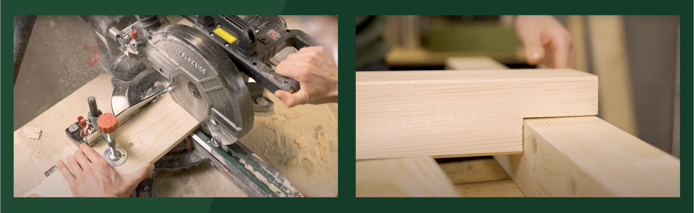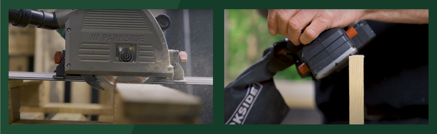 Prvým krokom je narezanie dreva na správnu dĺžku pomocou PARKSIDE® Skracovacej a pokosovej píly PZKS 2000 C3. Integrovaný laser zaručuje zvýšenú presnosť rezania. Aby pohovka vydržala väčšie zaťaženie, bočné časti a opierky rúk sú opatrené takzvaným nadrezom. Predpripravené diely sa potom dajú jednoducho uložiť jeden do druhého a zlepiť. Zostavená konštrukcia sa tiež upevní na mieste pomocou skrutiek. Hneď po zaschnutí lepidla sa tieto opäť odstránia a nahradia drevenými kolíkmi, ktoré zabezpečia atraktívnejší vzhľad. Do podkonštrukcie sa tiež vypíli zárez pre priečne vzpery, aby sa neskôr zabezpečilo, že sedadlo bude v jednej rovine. PARKSIDE® Aku excentrická brúska PAEXS 20-Li B2 s nastaviteľnou rukoväťou potom zabezpečí dokonalú povrchovú úpravu. Ochranu pred poveternostnými vplyvmi zabezpečuje vhodný náter do každého počasia, ktorý je na konci štedro aplikovaný na brúsené miesta.
