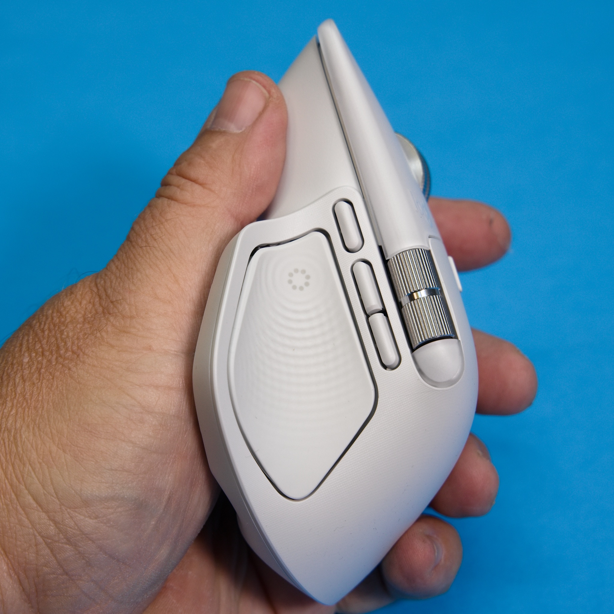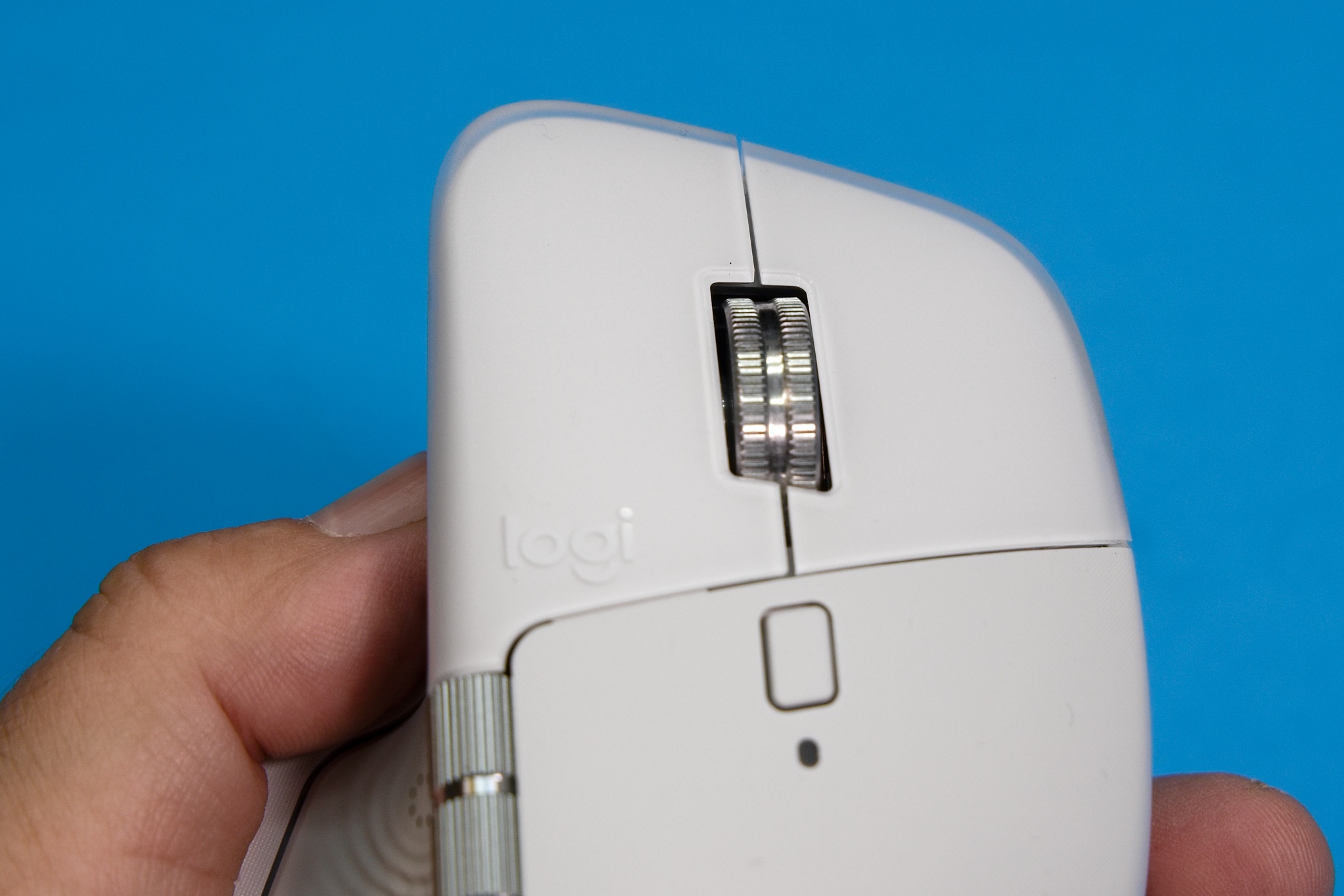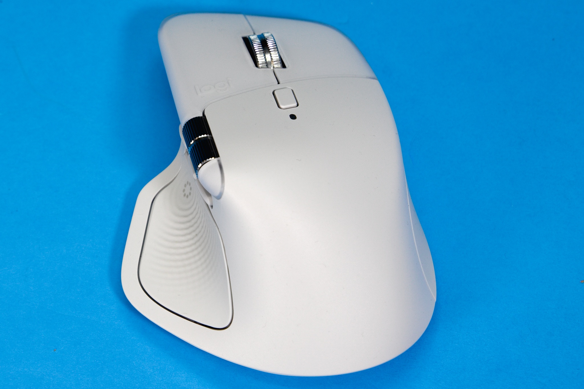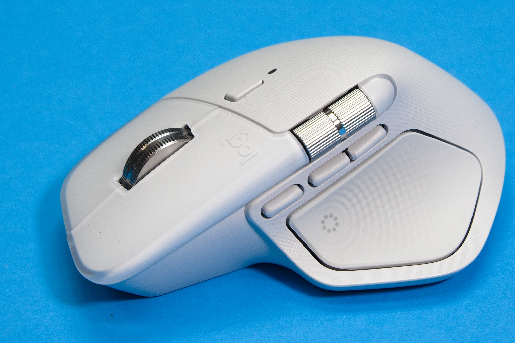 Opis začnem kolieskom MagSpeed, ktoré umožňuje klasické pomalé rolovanie s mechanickou reakciou jednotlivých krokov, ale energickejším pohybom prsta elektromagnetická aretácia povolí, koliesko sa roztočí voľne a rýchlo, takže v rozsiahlejších dokumentoch môžete rolovať rýchlosťou až 1000 riadkov za sekundu. Výrobca tieto režimy označuje Ratchet a FreeSpin. Citlivosť automatického prepínania nazývaného SmartShift môžete nastaviť softvérovo v aplikácii Logi Options+. Malé tlačidlo pod hlavným rolovacím kolieskom je konfigurovateľné, v implicitnom nastavení mení režim rolovacieho kolieska. Ja som ho nikdy nepoužil, automatické prepínanie mi úplne vyhovovalo, takže väčšina používateľov si naň zrejme nastaví inú funkciu. Používateľ má k dispozícii aj samostatné koliesko implicitne nastavené na horizontálne rolovanie, ktoré je v ergonomickom dosahu palca. Jeho funkciu môžete zmeniť, praktické je napríklad prechádzanie medzi záložkami v aplikáciách, ktoré majú takéto používateľské rozhranie, nastavenie hlasitosti, zoomovanie a podobne. Pod ním sú tri malé tlačidlá.