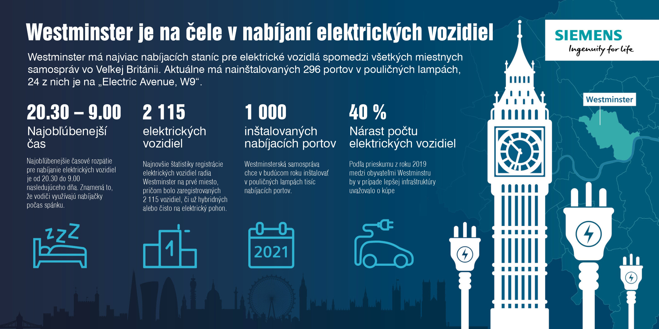 Na Sutherland Avenue v srdci britského hlavného mesta si môžu obyvatelia nabiť svoje elektromobily priamo z pouličných lámp. O novú funkciu verejného osvetlenia sa postarali technológie Siemens a Ubitricity. Na Sutherland Avenue v londýnskej centrálnej štvrti Westminster je radová zástavba domov vo viktoriánskom štýle. Je luxusná a príjemná, no pre záujemcov o kúpu elektromobilu znamená problém – k vozidlu by museli dobíjací kábel z bytu natiahnuť cez rušný chodník. Na podobné prekážky narážajú prakticky vo všetkých veľkomestách, kde nie je nereálne, aby ľudia bývali v rodinných domoch s príjazdovou cestou. Electric Avenue Práve verejná nabíjacia infraštruktúra brzdí rýchlejší nástup elektromobily v mestách. Podľa prieskumu spoločnosti Siemens si viac ako tretina britských motoristov plánuje v budúcnosti kúpiť hybridné alebo plne elektrické vozidlo. Až 40 percent respondentov však nákup odkladá kvôli nedostatočnej verejnej nabíjacej infraštruktúre. Natiahnuť kábel z bytu k vozidlu ...Článok je uzamknutý