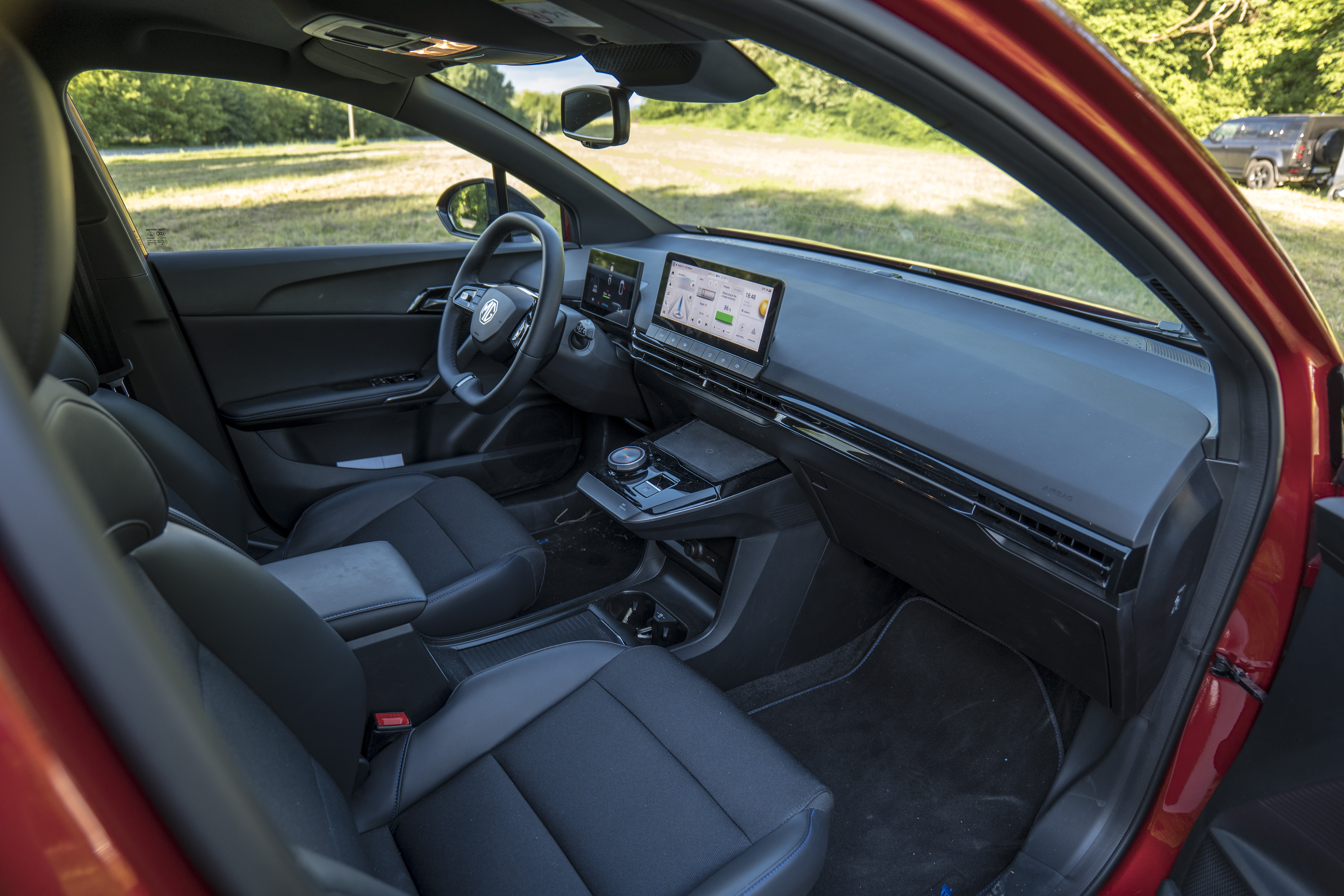 Kabína je v podstate zhodná so štandardnou verziou. Zaujme jej priestrannosť a slušné spracovanie. Stredová konzola je krátka a nesie iba volič jazdných režimov, elektrickú parkovaciu brzdu a podložku na bezdrôtové nabíjanie mobilu. Tá však, žiaľ, nemá žiadnu výraznejšiu zarážku, a tak sa vám pri prudkom zrýchlení môže stať, že mobil bude lietať po kabíne. Dole sú držiaky na nápoje a pomerne veľká priehradka so zasúvateľnou roletou. To je vhodné miesto aj na mobil, ak chcete využívať napríklad Android Auto. To je dostupné zatiaľ iba po kábli. Konektor USB-A je ukrytý práve pod stredovou konzolou. Je tu aj USB-C, ten však slúži iba na nabíjanie. V lakťovej opierke je ďalší odkladací priestor. Žiaľ, zostali aj lesklé plochy s klavírnym lakom, takže o neustále utieranie od prachu a odtlačkov prstov máte postarané. Lesklá je aj dvojica displejov, o zobrazenie jazdných údajov sa stará menší 7" displej prístrojového panela, ktorého zobrazenie však s výnimkou maličkostí nemožno nijako ovplyvniť. Centrálny 10,25" displej má vysoké rozlíšenie a vcelku vydarenú grafiku. Pod ním je rad hardvérových tlačidiel na priame ovládanie vyhrievania a vstup do menu klimatizácie, tlačidlo domov a ovládanie hlasitosti. Viacero podstatných funkcií, ako napríklad zmena jazdného režimu alebo zmena účinnosti rekuperácie, sa ovláda cez displej. Našťastie sa tieto funkcie dajú namapovať na dvojicu používateľských tlačidiel s hviezdičkou na volante. Na rozdiel od nižších verzií je vo výbave aj navigácia. Veľa používateľov sa však aj tak radšej spolieha na Android Auto alebo Apple CarPlay, ktoré síce fungujú iba cez kábel, ale zato spoľahlivo. Displej umožňuje prepnutie do svetlého alebo tmavého zobrazenia, škoda len, že prístrojový panel využíva iba tmavý režim.