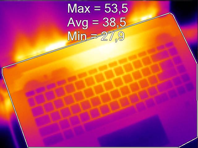 Zahrievanie povrchu notebooku miestami presahuje až 50 stupňov Celzia – je to daň za tichší chod aj vo vysokej záťaži