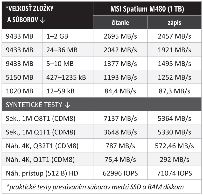 Spatium M480 je jedno z troch prvých SSD, ktoré MSI historicky vydalo – to najvýkonnejšie. Je v 80 mm formáte M.2 a používa rýchlu zbernicu PCI Express 4.0, ktorú už podporujú všetky moderné počítače. Z troch dostupných kapacitných variantov (500 GB, 1 TB a 2 TB) sme do testov išlo po zlatej strednej ceste. SSD s 1 TB má aj najpriaznivejšiu cenu za v prepočte na jeden gigabajt úložného priestoru.