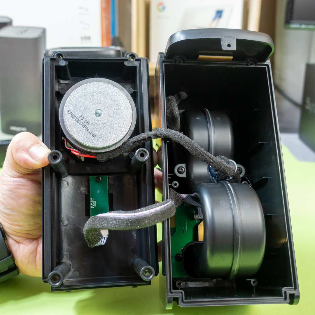 Po odobratí predného panelu som zistil, že reproduktorové sústavy sú jednopásmové, čiže majú len jeden širokopásmový reproduktor 2,75”. Ako sa podarilo pokryť celý počuteľný frekvenčný rozsah? Výšky nie sú až taký problém, dobré basy sú podľa údajov výrobcu dosiahnuté pomocou technológie BasXPort. Čo to v praxi znamená? Reproduktory sa ľahko rozoberajú, tak nebol problém nahliadnuť dovnútra. Na zadnej strane je oválny basreflexový otvor. Vo vnútri je k tomuto otvoru upevnená pomerne dlhá basreflexová trubica v tvare písmena S, ktorá má rovnaký oválny prierez ako otvor.