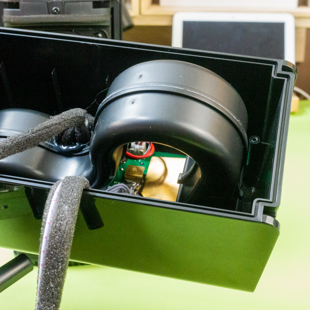 Druhý koniec trubice ústi nad mosadzným plechom upevnenom na plošnom spoji elektroniky, takže prúdenie vzduchu v trubici zároveň chladí elektroniku.