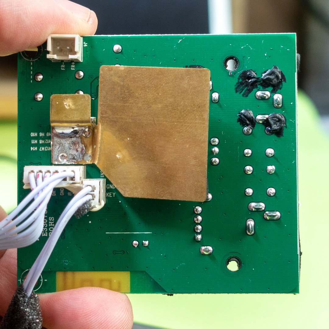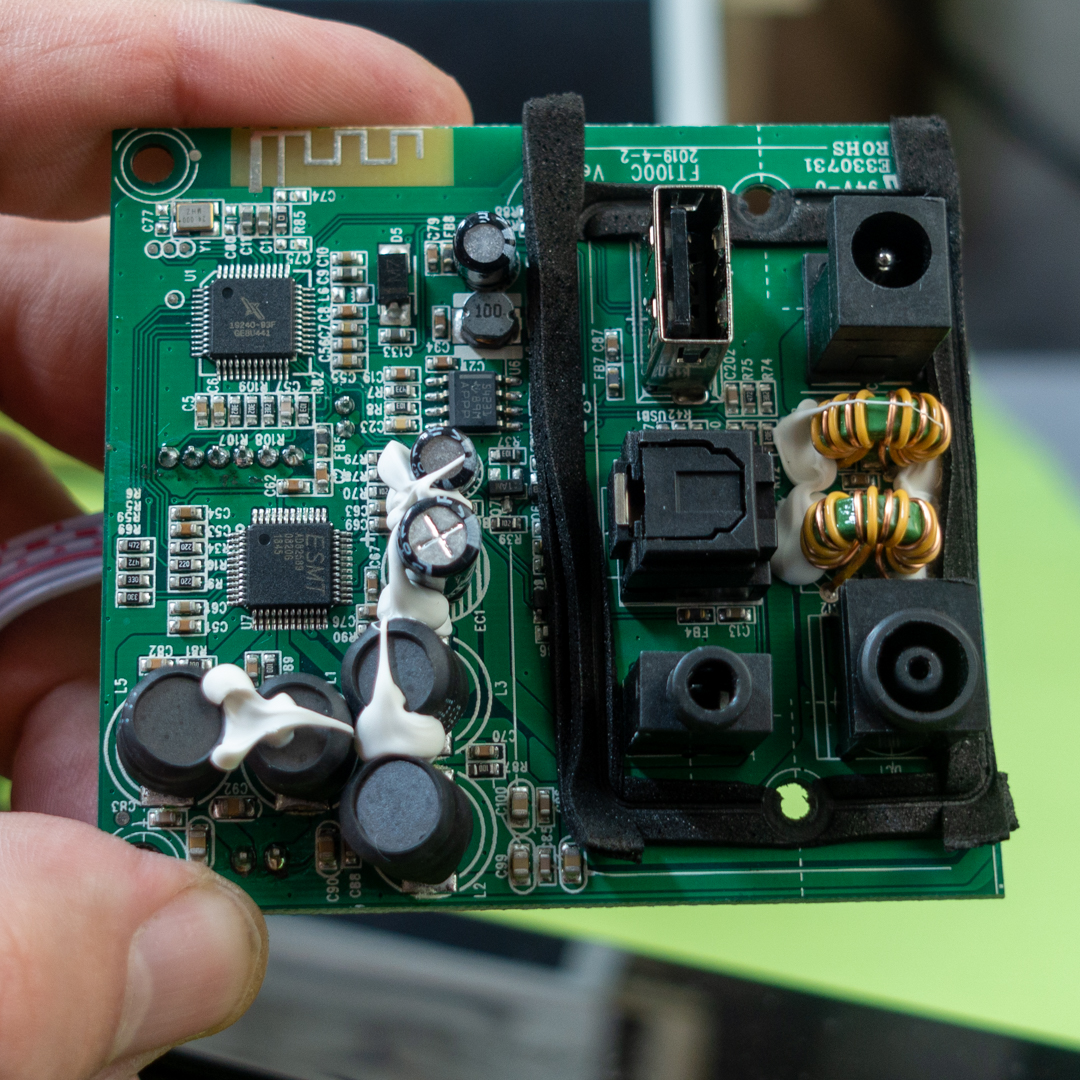 Doska elektroniky s chladiacim plechom na plošnom spoji. Na doske nie sú veľké kondenzátory, ktoré by pokryli špičkový výkon