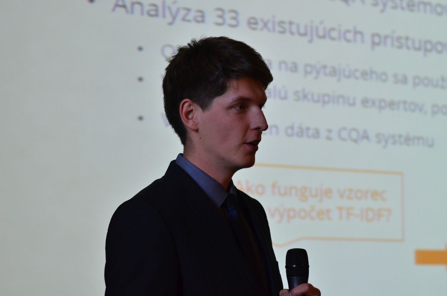 Druhé miesto obsadil študent Fakulty informatiky a informačných technológií STU Jakub Mačina s diplomovou prácou Odporúčanie nových otázok v online komunitách študentov.