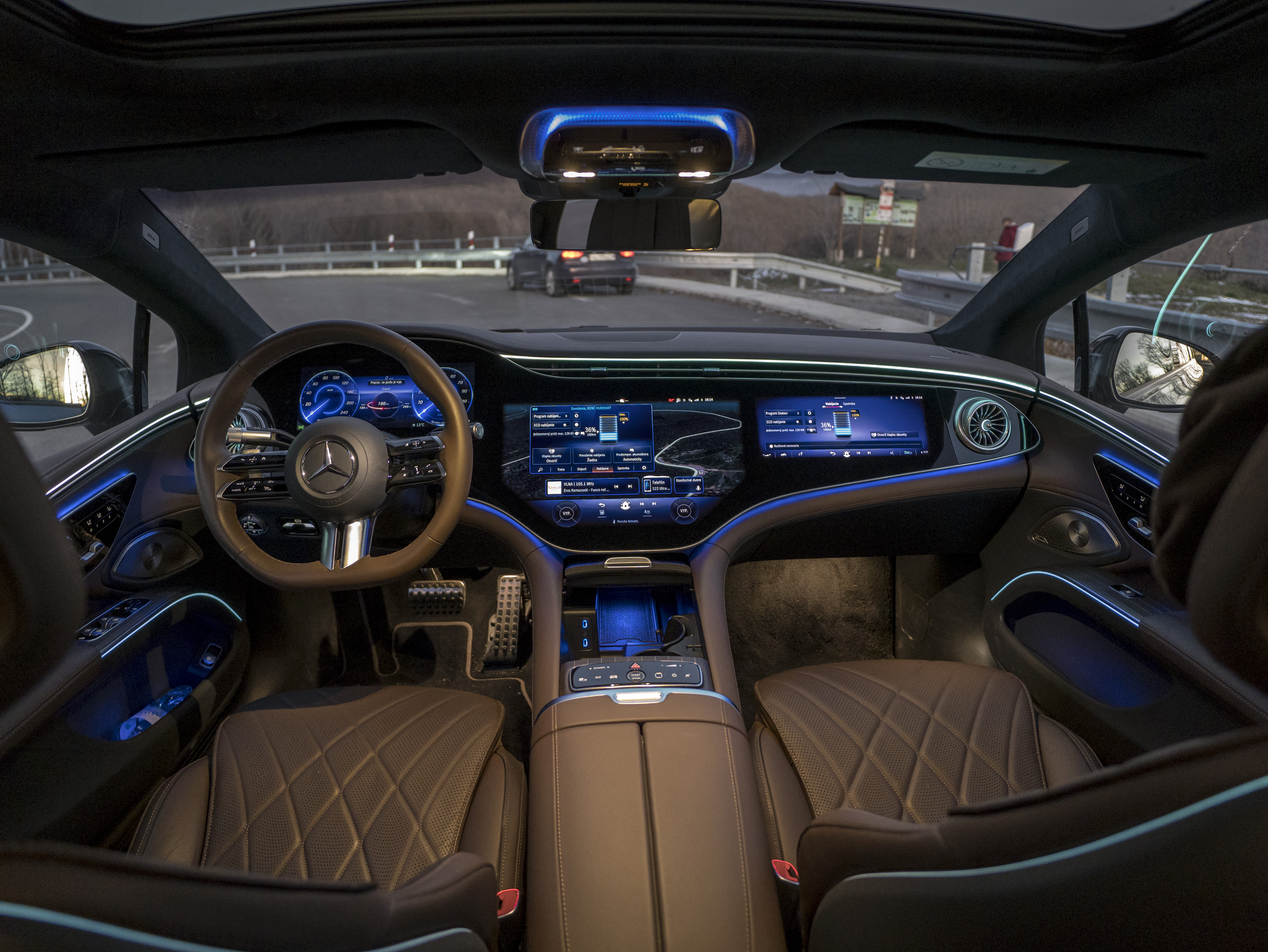 Mercedes EQS je však predovšetkým o nadštandardnom komforte a priestore. Zadné riaditeľské kreslo umožňuje sklopenie do ležiacej polohy spolu s odsunutím predného sedadla tak, aby vznikol väčší priestor na nohy. Všetky kreslá sú elektricky nastaviteľné, vyhrievané aj odvetrávané a všetky majú aj masážnu funkciu. Dvere sú otvárané a zavierané elektricky a môže ich všetky ovládať aj vodič z hlavného displeja. Kabína má veľmi pekné, možno až trocha do gýču zachádzajúce ambientné osvetlenie, ktoré si môžete plne konfigurovať, prípadne zapnúť dynamický režim, kde bude reagovať na rýchlosť a režim jazdy. Okrem toho je tu ešte niekoľko ďalších typov osvetlenia – divadelné, na čítanie alebo priestorové. Všetci cestujúci majú k dispozícii hlavové vankúšiky MANUFAKTUR a zadný aj vankúše pod kríže. S priestrannou kabínou korešponduje aj skutočne obrovský kufor, na ktorého prednú časť je už problém dočiahnuť. Rovnako pohodlne doň teda zmestíte súpravu golfových palíc aj dovolenkovú výbavu.