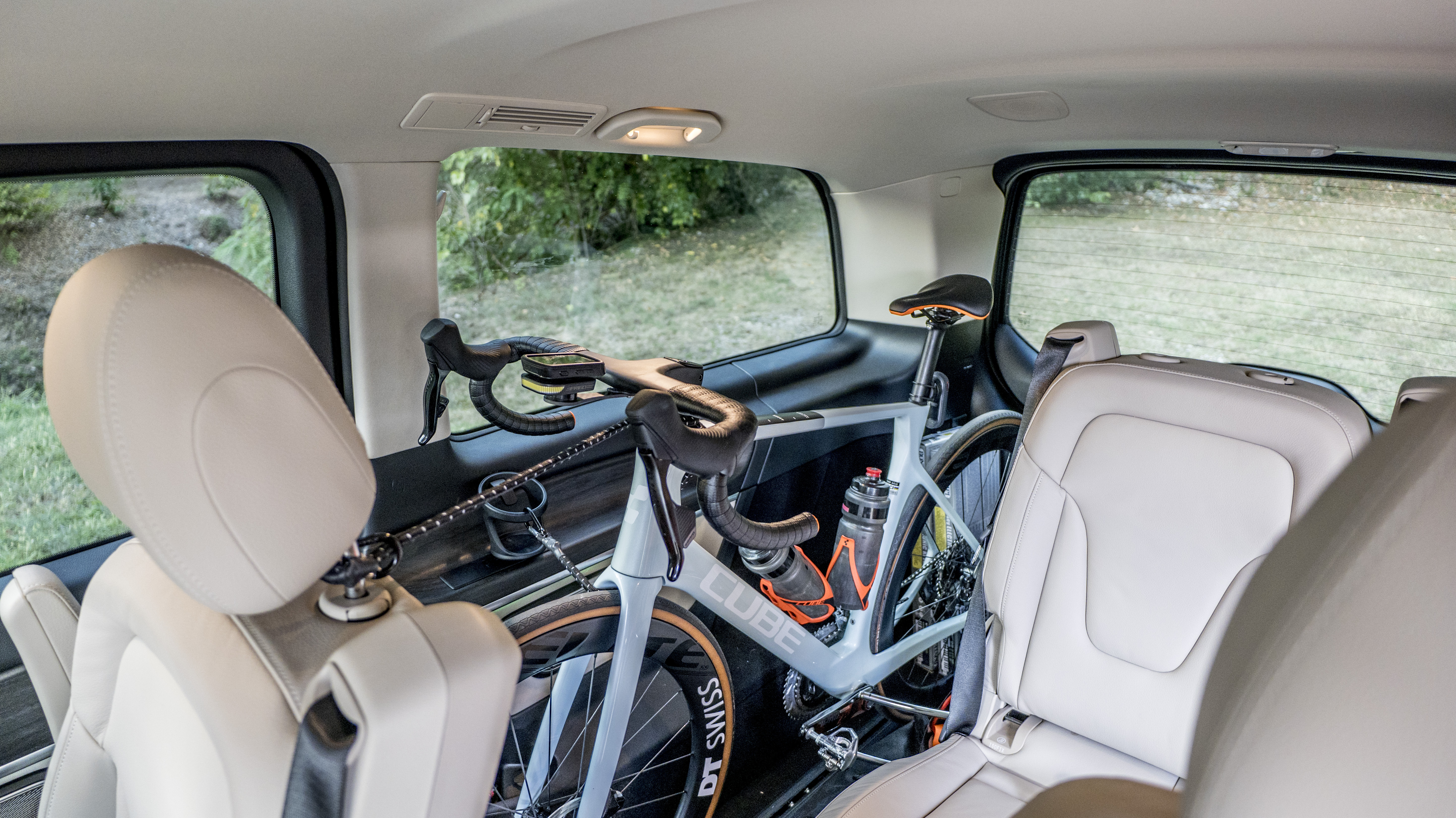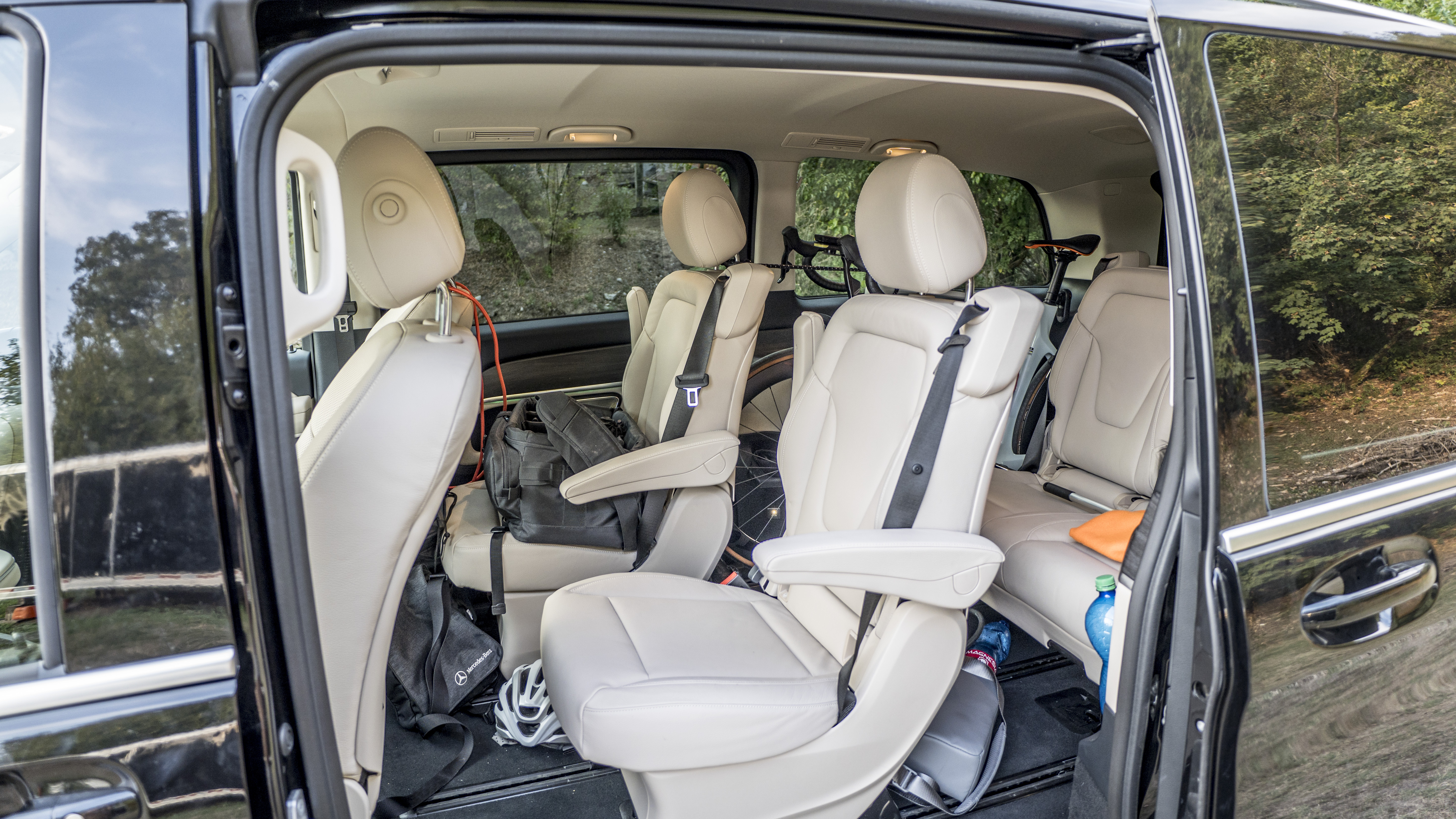 EQV 300 zrýchli z 0 na 100 km/h za 12,1 sekundy. Maximálna rýchlosť je obmedzená na 140 km/h, ale na požiadanie môže byť v Európe zvýšená na 160 km/h ako v prípade nášho vozidla. Batéria s kapacitou 90 kWh ponúka dojazd až 344-365 km podľa WLTP. Maximálny výkon DC rýchleho nabíjania je 110 kW. To sa nezdá veľa, ale systém vďaka upravenému softvéru s plochou nabíjacou krivkou teraz nabije batériu z 10 na 80 % asi za 40 minút, teda o päť minút rýchlejšie ako predtým. EQV prichádza štandardne so šiestimi sedadlami, ale dá sa nakonfigurovať až pre osem cestujúcich. Testovacie vozidlo bolo v 7-miestnej konfigurácii. Sedadlá v druhom a treťom rade sú posuvné a možno ich úplne odstrániť. Pri testovaní sme využili to, že zadná trojmiestna lavica je delená v pomere 2:1 a pravá sedačka sa dá samostatne vybrať. Vďaka tomu nám vznikol priestor na bicykel a 6 cestujúcich. Sedadlá v druhom rade sú vybavené vyhrievaním a odvetrávaním.