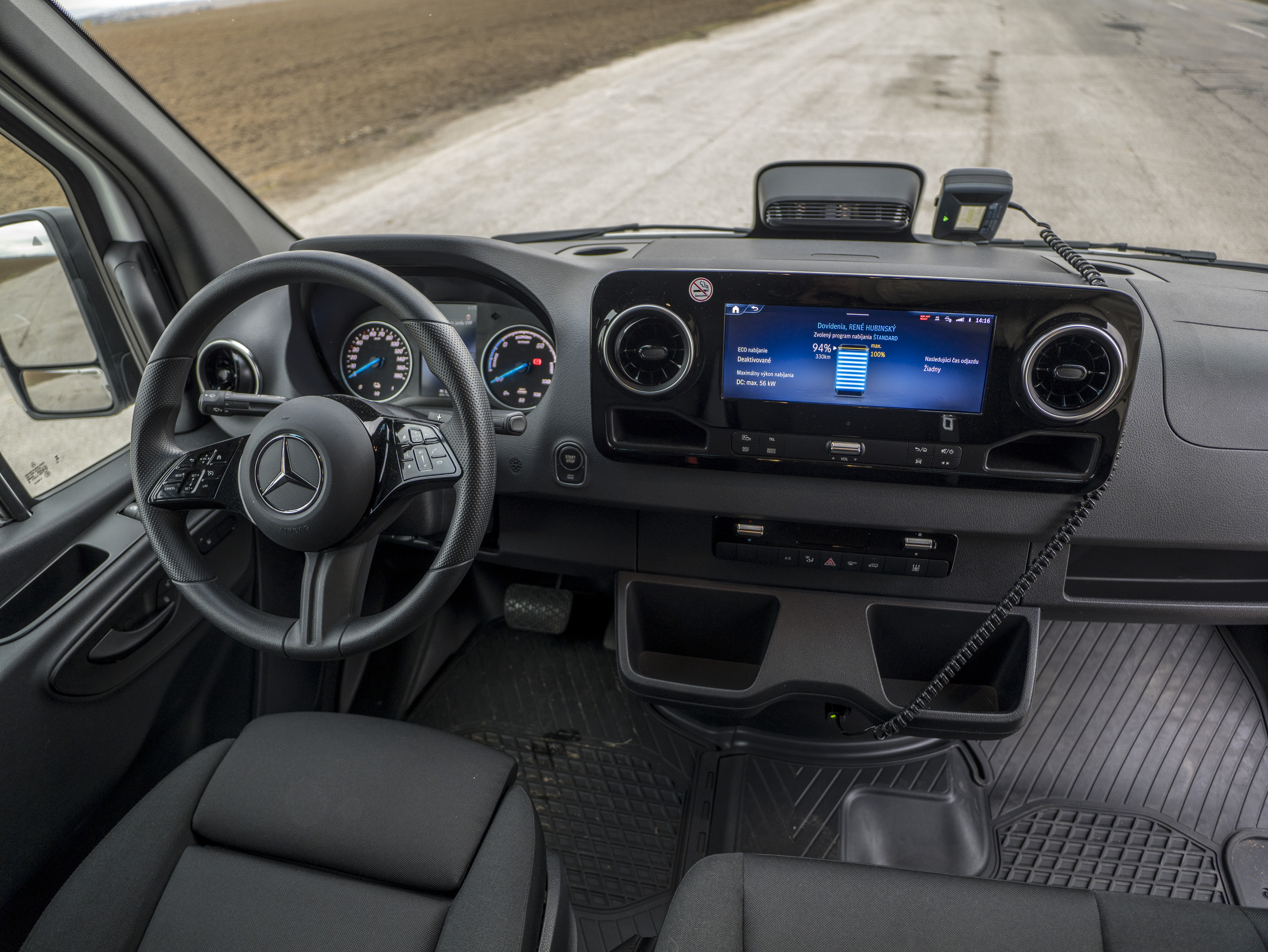 Špecifikom je, že eSprinter (v testovanej verzii) spadá do kategórie N2 s prípustnou hmotnosťou do 4,25 tony. Pri vozidlách tejto kategórie je potrebné dodržiavať určité pravidlá, najmä na spoplatnených úsekoch ciest. Vozidlá kategórie N2 s alternatívnym pohonom vrátane elektrického majú výnimku pre vodičov s preukazom skupiny B, ak vodič vlastní preukaz aspoň dva roky. Ak celková hmotnosť vozidla nepresiahne 3,5 tony, môže sa používať v okruhu do 100 km od sídla spoločnosti, na ktorú je registrované. Pri hmotnosti nad 3,5 tony a do 4,25 tony je povinné používať tachograf spolu s kartou vodiča. Na spoplatnených úsekoch treba použiť mýtnu jednotku na úhradu poplatkov. Tachograf je, samozrejme, súčasťou výbavy, je zabudovaný hore nad hlavou vodiča. Vzhľadom na hmotnosť nad 3,5 tony má vozidlo obmedzenú maximálnu rýchlosť na 90 km/h, čo sa priaznivo prejavuje na spotrebe, ale na diaľnici pôjdete väčšinou v kolóne s kamiónmi. Vo vozidle bola aj mýtna jednotka, k nej mám však malú poznámku. Mýtna jednotka (aspoň tá slovenská) je pomerne veľké zariadenie, ktoré sa umiestňuje na predné sklo a potrebuje 12 V napájanie. Výrobca umiestnil jednu 12 V zásuvku aj šikovne pod stredný kryt odkladacieho priestoru pod predným sklom, žiaľ, zabudol na otvor na kábel. Ak teda nechcete do krytu vŕtať, musíte mýtnu jednotku pripojiť do druhej zásuvky umiestnenej asi v strede predného panela, takže neprakticky ťaháte kábel cez celú palubnú dosku. Toto mohli inžinieri urobiť lepšie. Ináč je kabína priestranná, s tromi sedadlami a množstvom odkladacích miest. Nákladový priestor je prístupný pravými posuvnými dverami alebo dvojkrídlovými zadnými dverami. Trocha zamrzí, že pri tejto cene vozidla výrobca stavil na kompletné žiarovkové osvetlenie vonku aj vnútri.